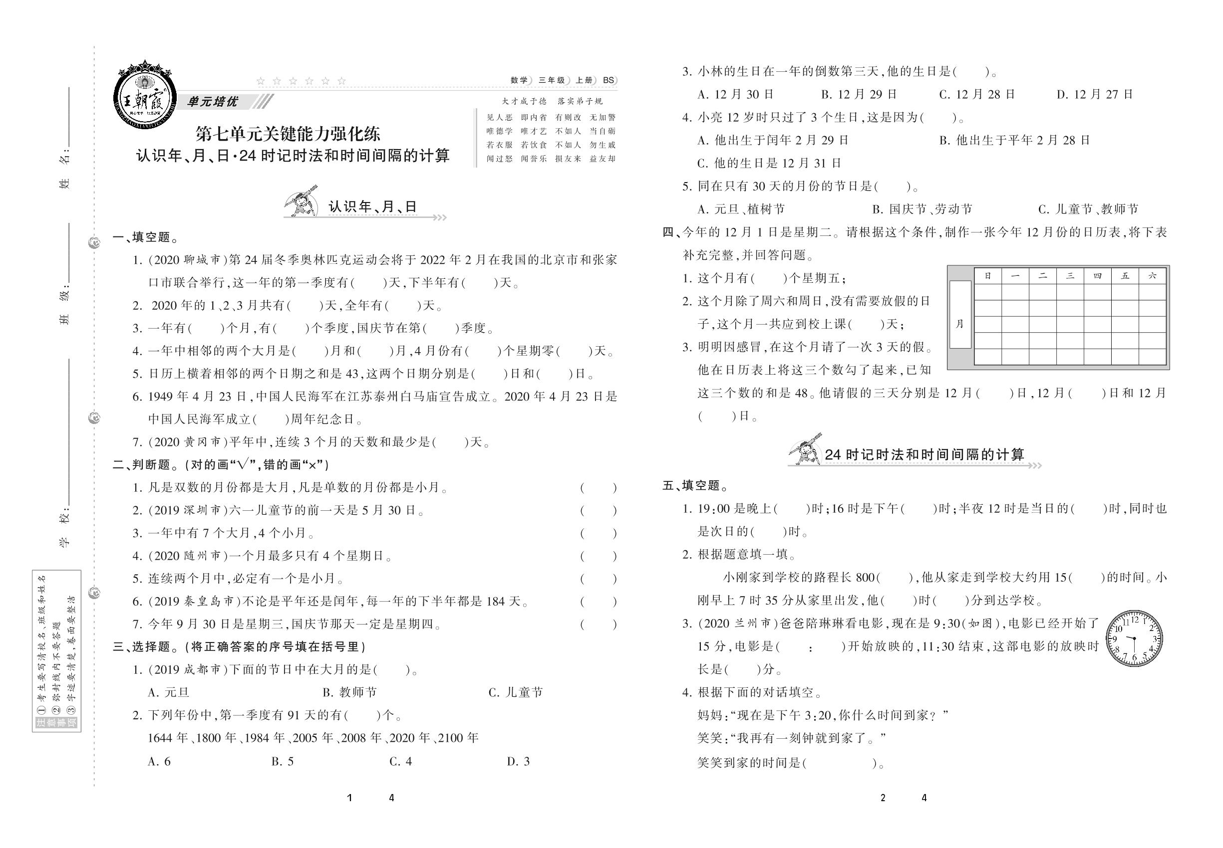 2020上册三年级数学北师版 第七单元 关键能力强化练