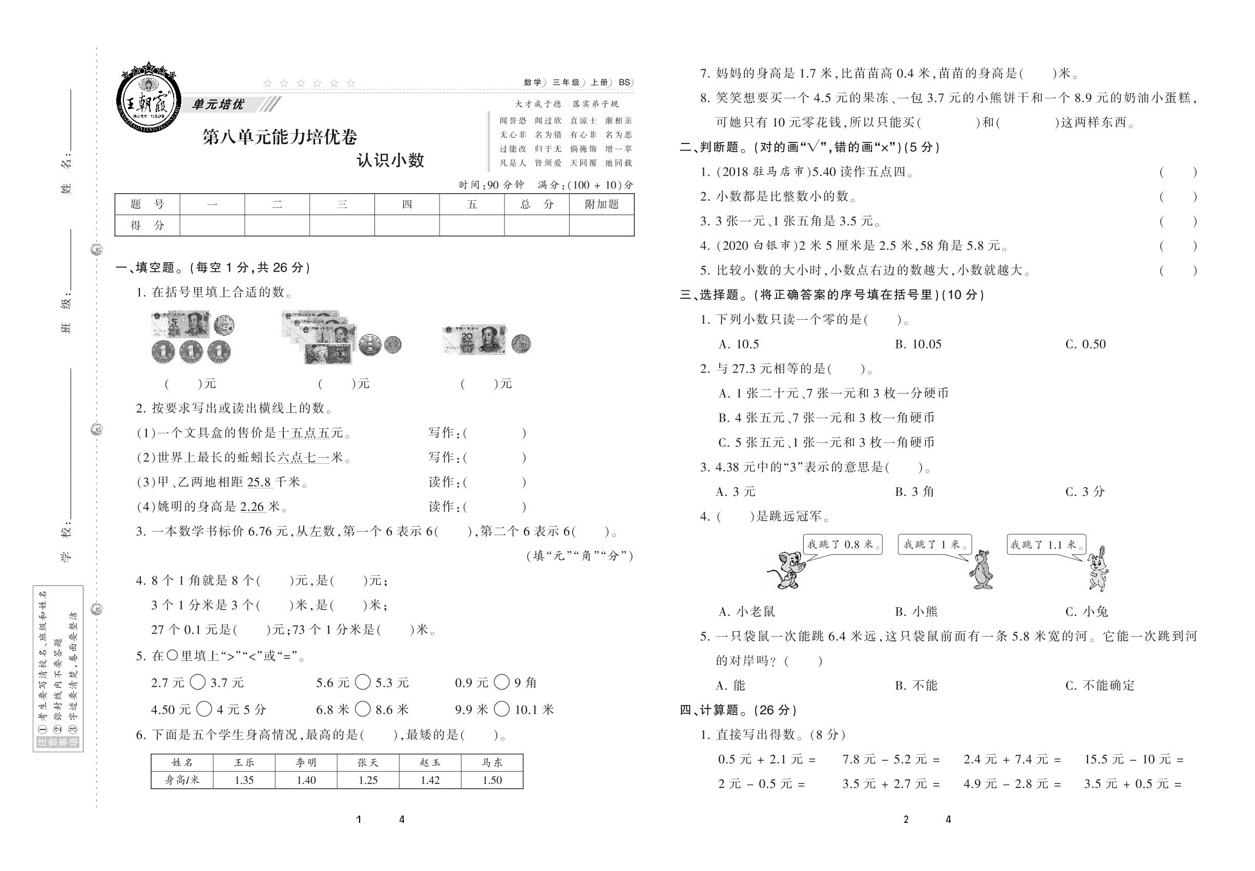 2020上册三年级数学北师版 第八单元 能力培优卷