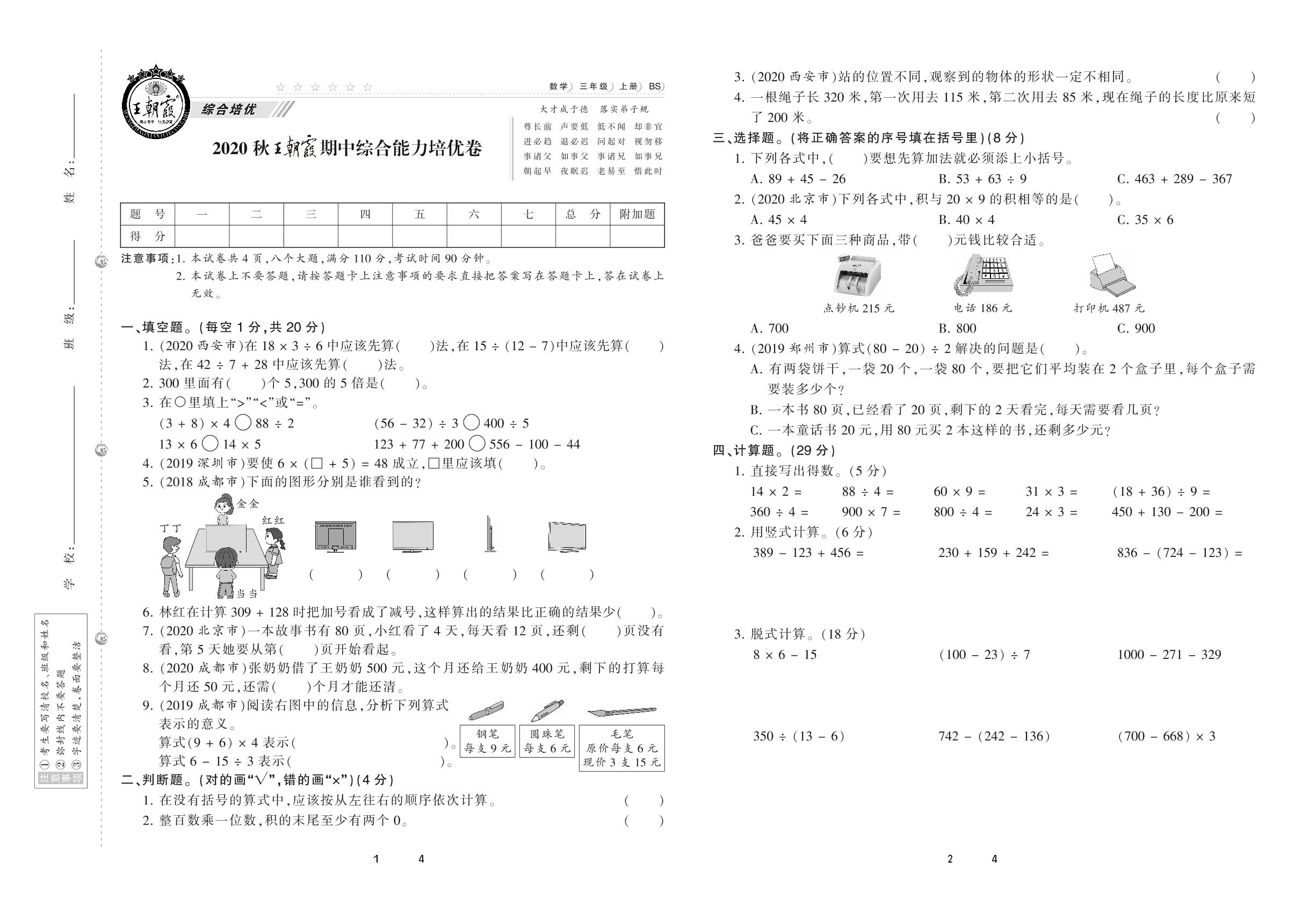 2020上册三年级数学北师版 王朝霞期中综合能力培优卷