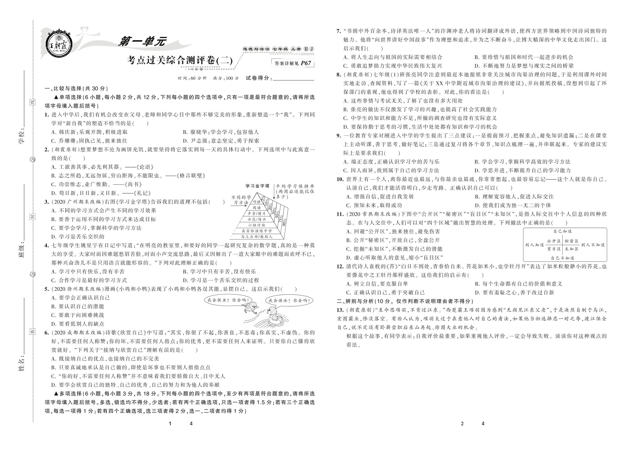 2020上册七年级道德与法治人教版 第一单元 考点过关综合测评卷(二)