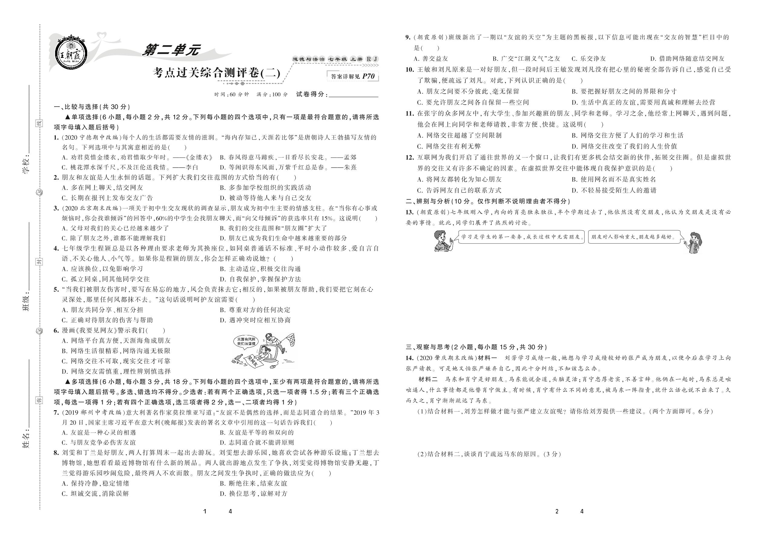 2020上册七年级道德与法治人教版 第二单元 考点过关综合测评卷(二)