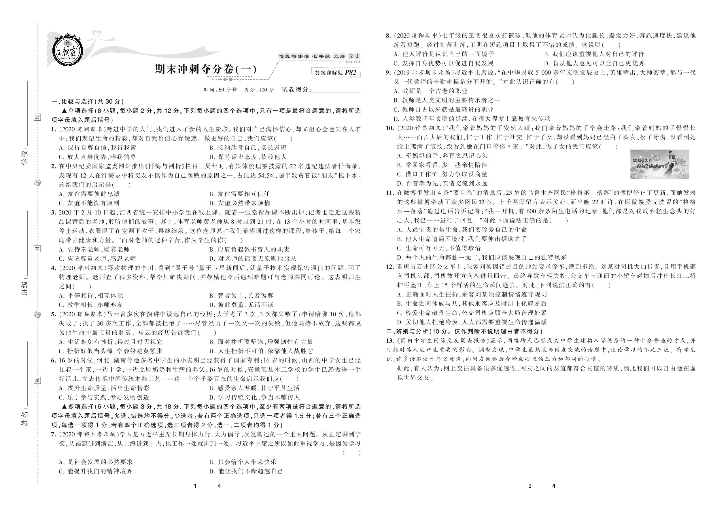 2020上册七年级道德与法治人教版 期末冲刺夺分卷(一)