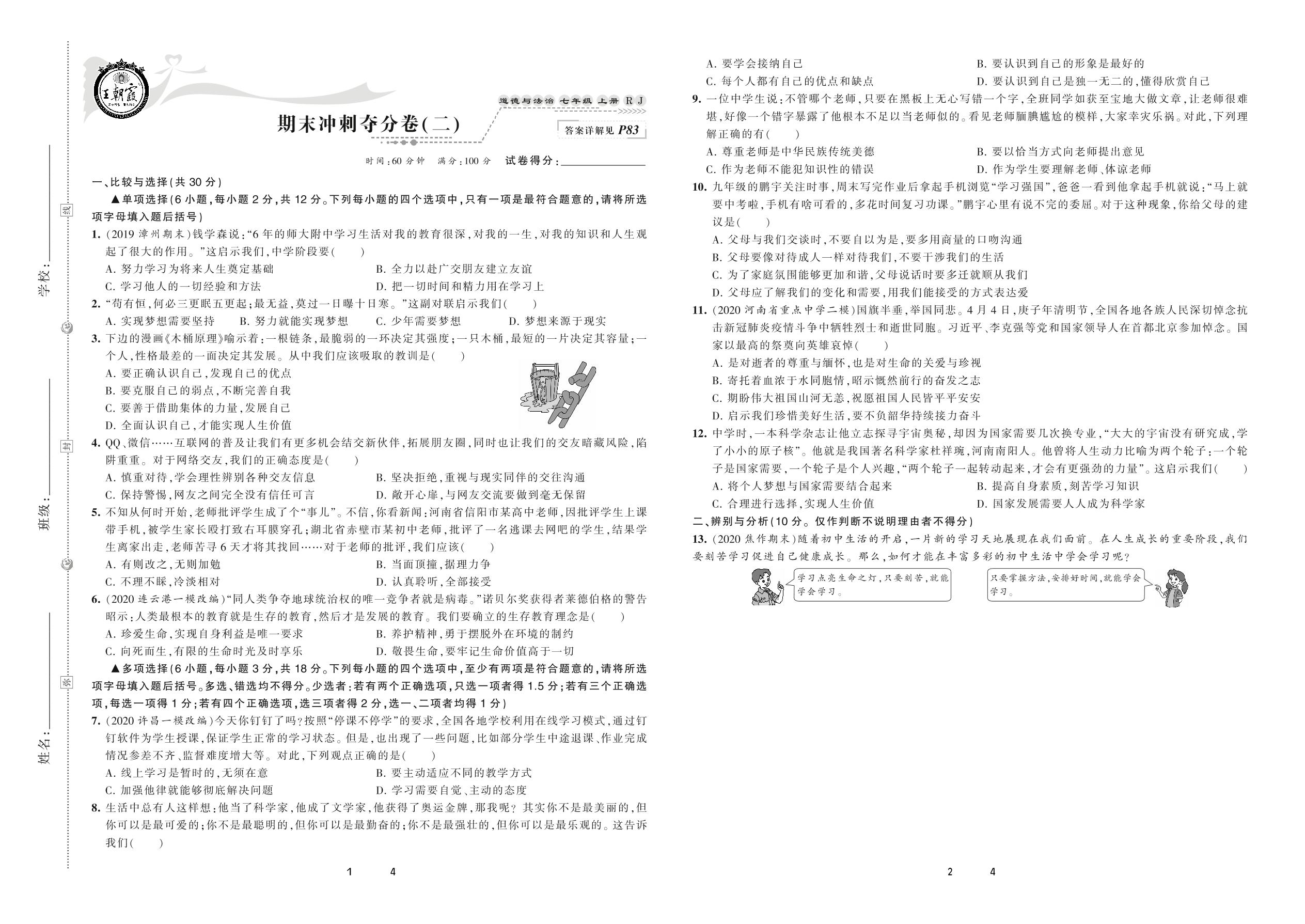 2020上册七年级道德与法治人教版 期末冲刺夺分卷(二)