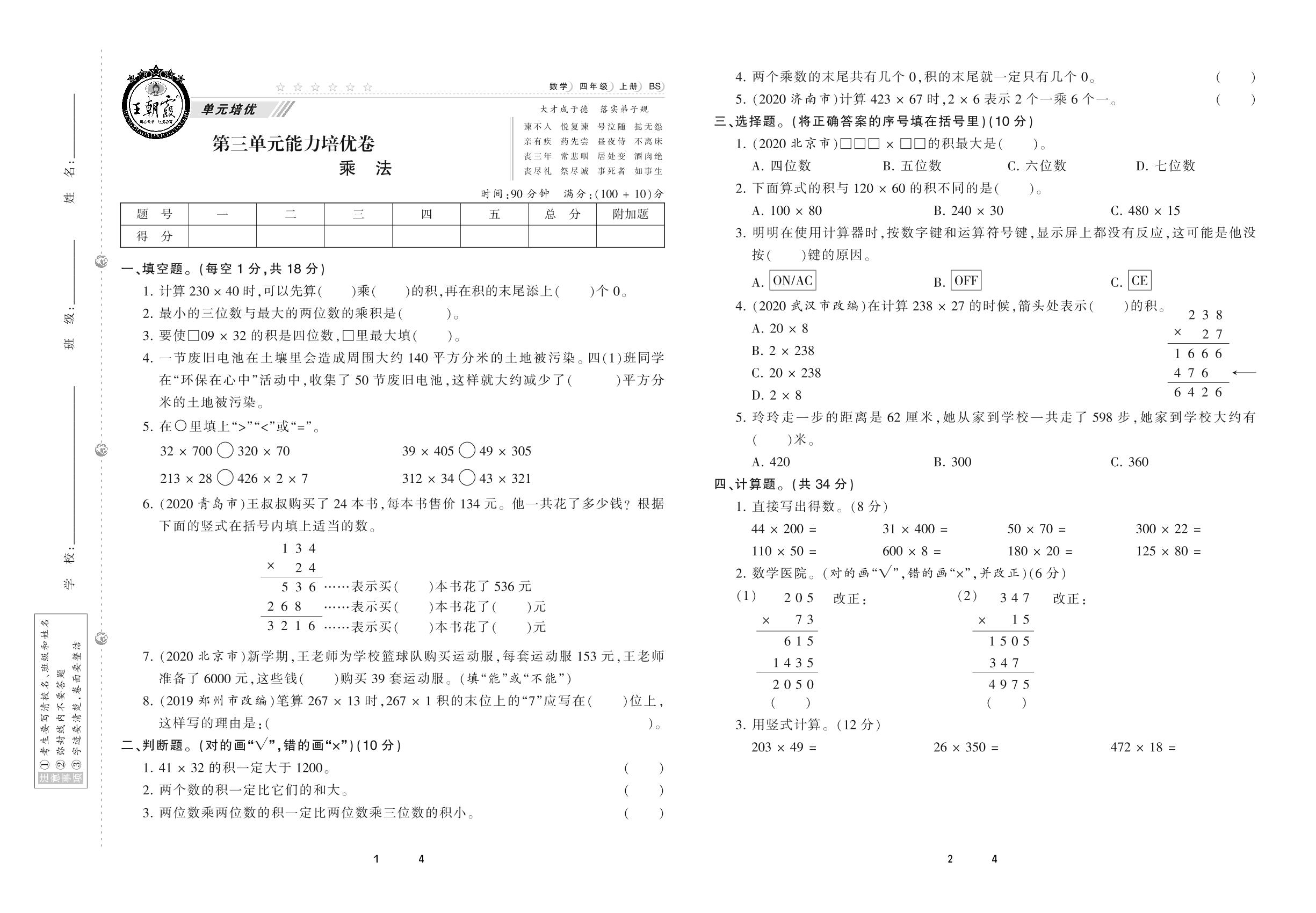2020上册四年级数学北师版 第三单元 能力培优卷