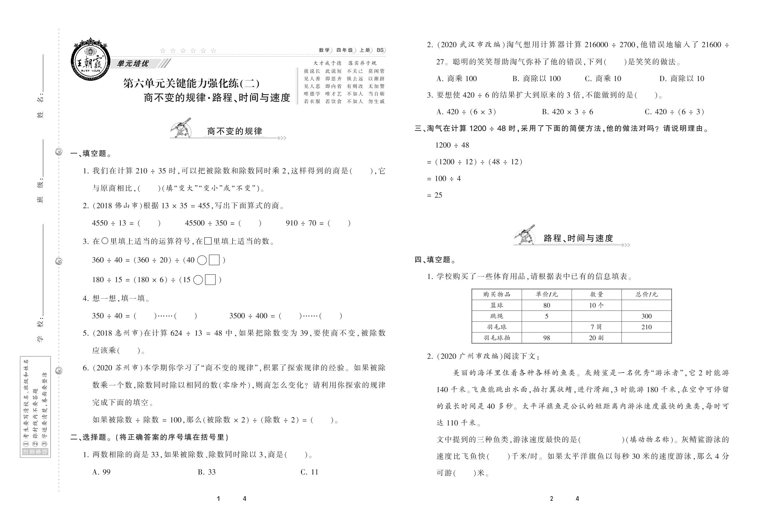 2020上册四年级数学北师版 第六单元 关键能力强化练(二)