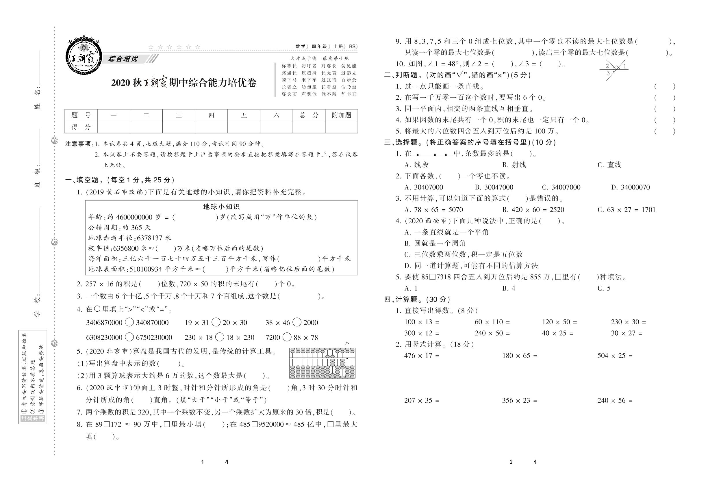 2020上册四年级数学北师版 王朝霞期中综合能力培优卷
