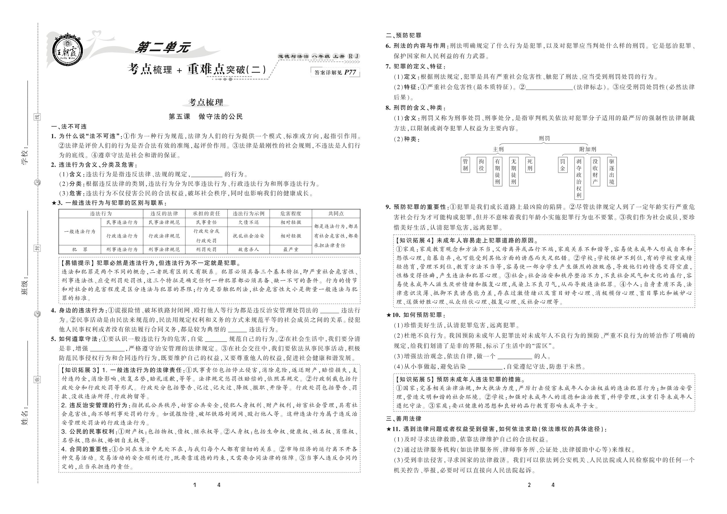 2020上册八年级道德与法治人教版 第二单元 考点梳理+重难点突破(二)