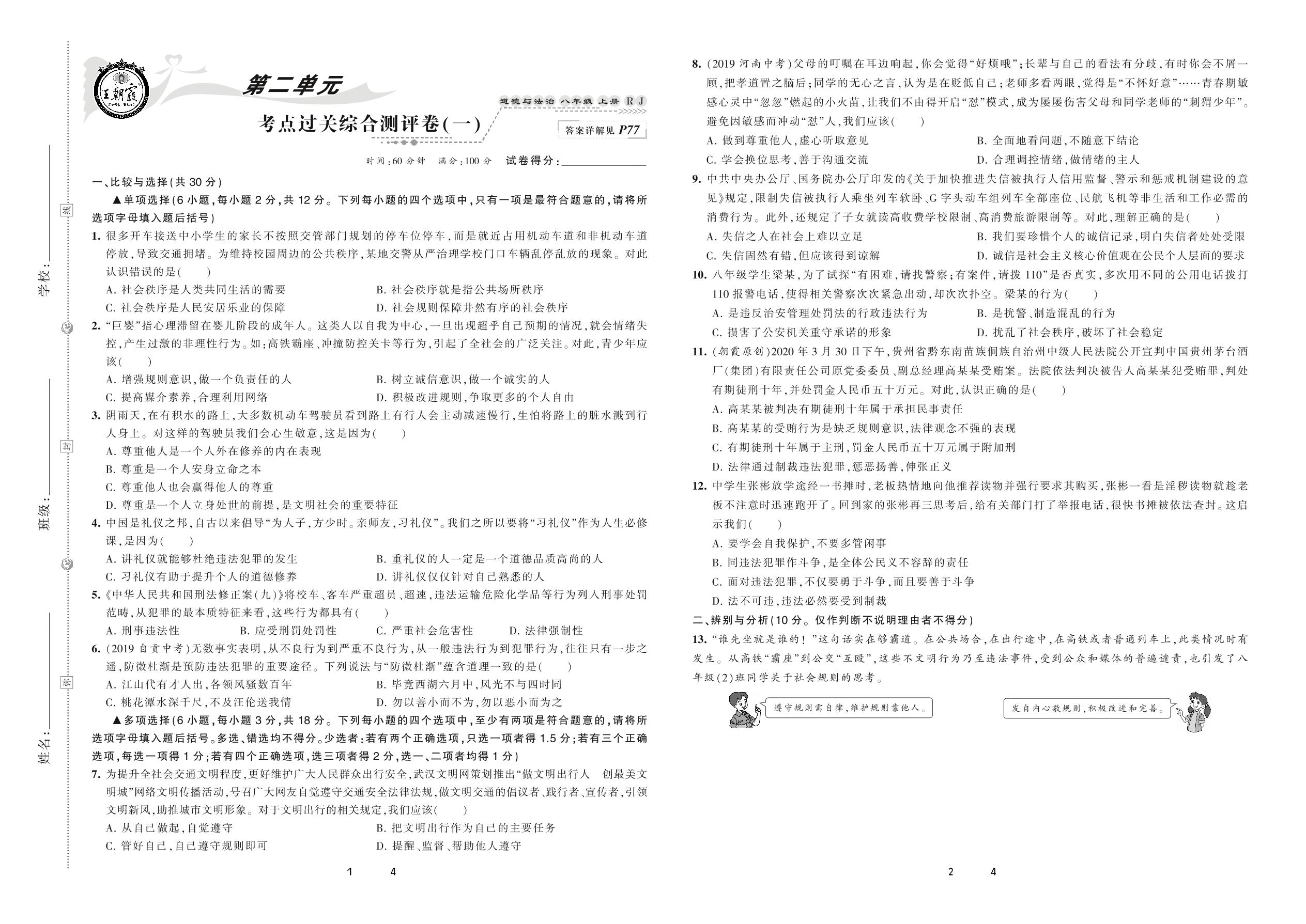 2020上册八年级道德与法治人教版 第二单元 考点过关综合测评卷(一)
