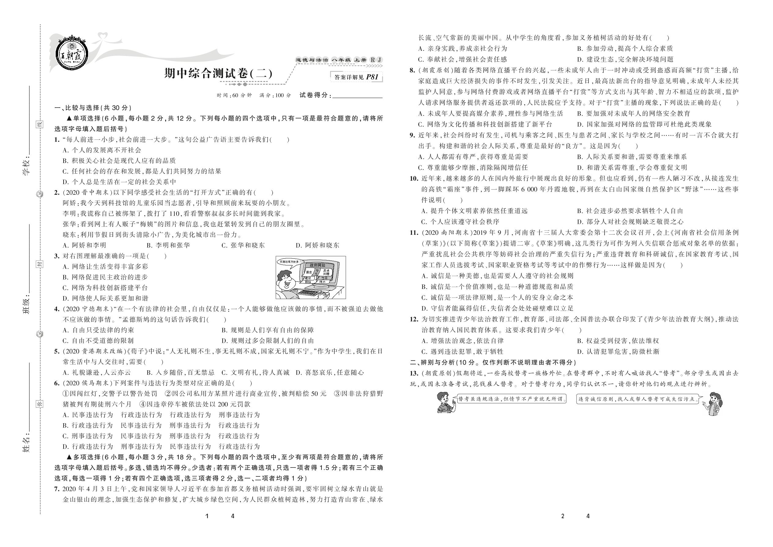 2020上册八年级道德与法治人教版 期中综合测试卷(二)