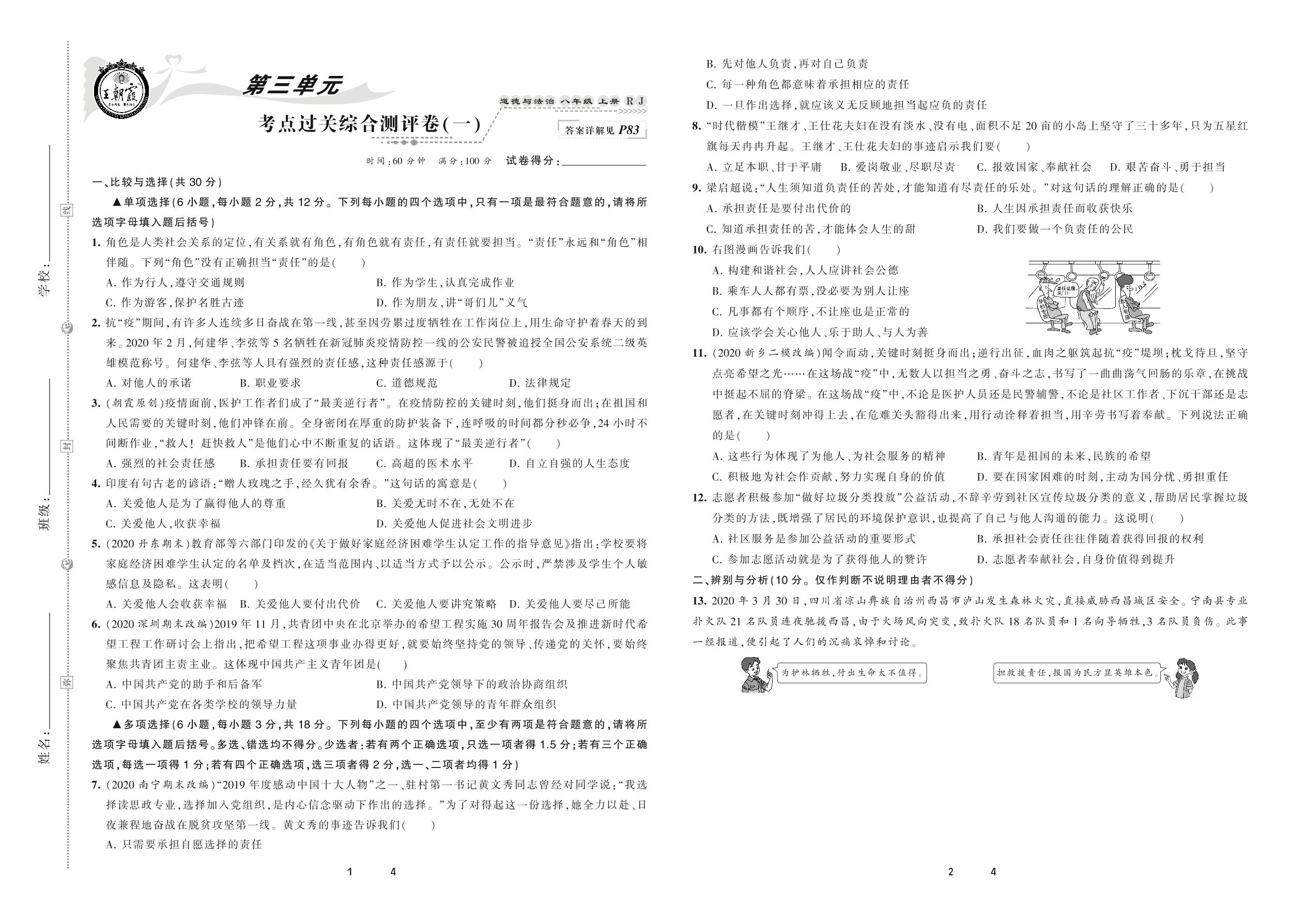 2020上册八年级道德与法治人教版 第三单元 考点过关综合测评卷(一)