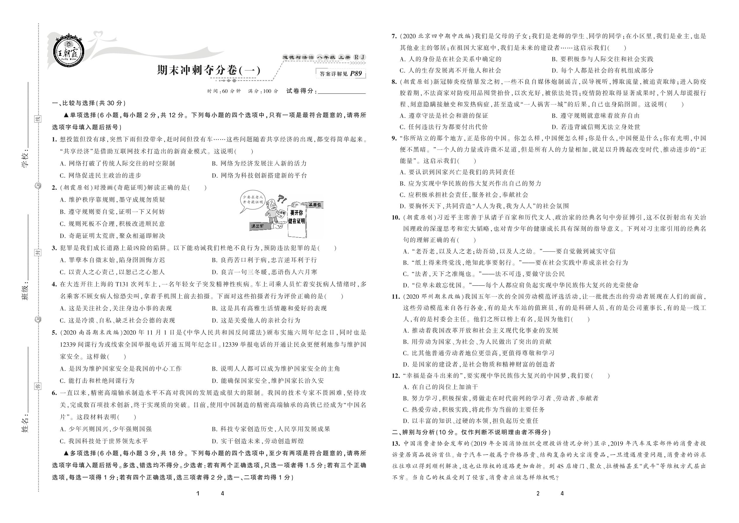 2020上册八年级道德与法治人教版 期末冲刺夺分卷(一)