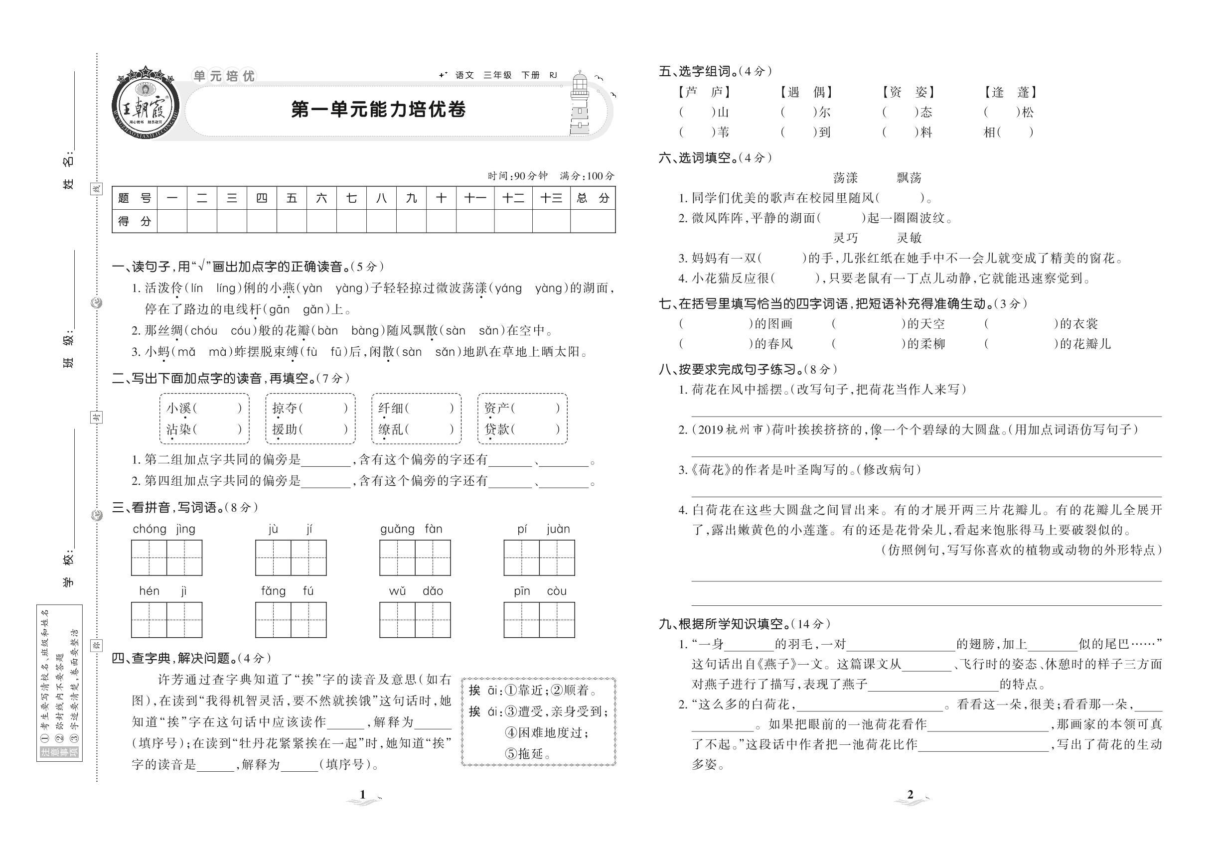 2021下册三年级语文人教版 第一单元 能力培优卷
