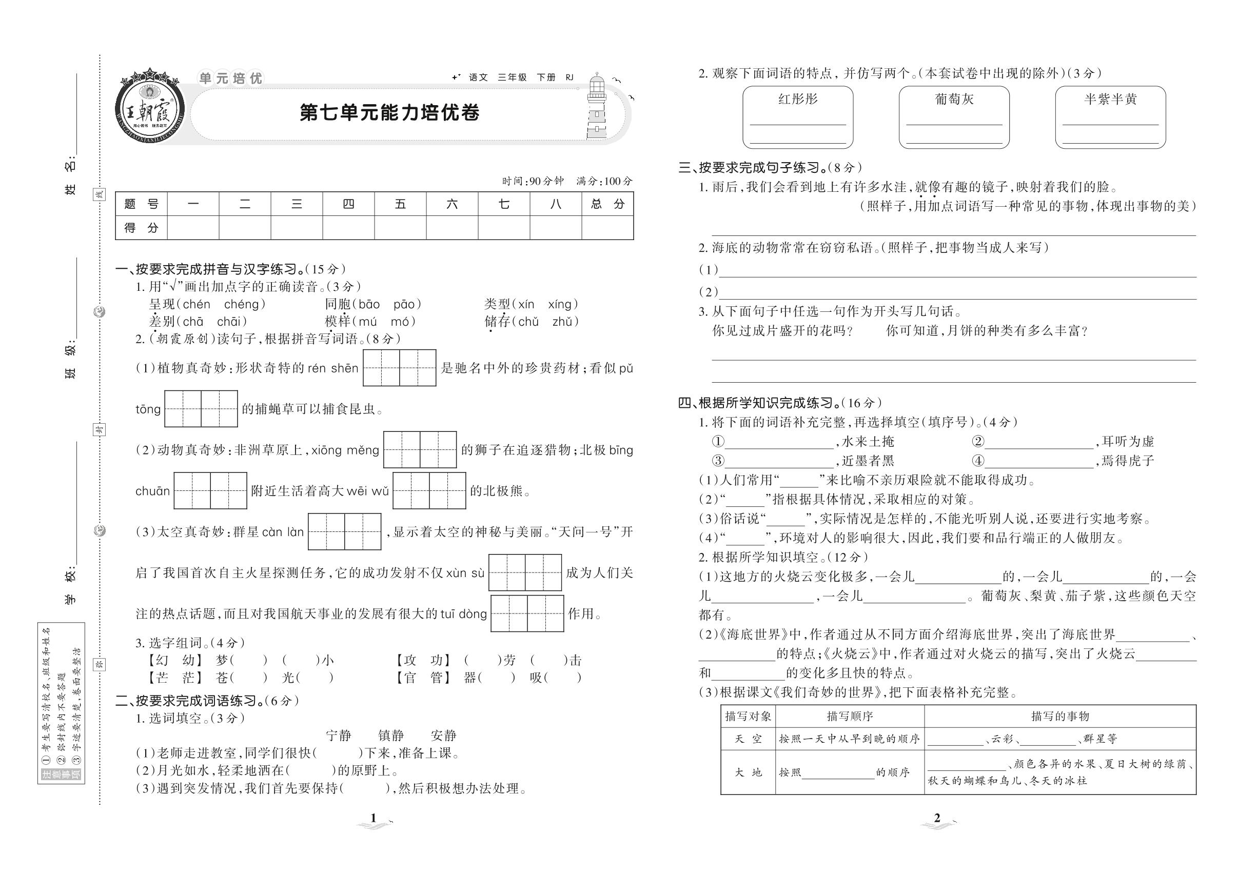 2021下册三年级语文人教版 第七单元 能力培优卷