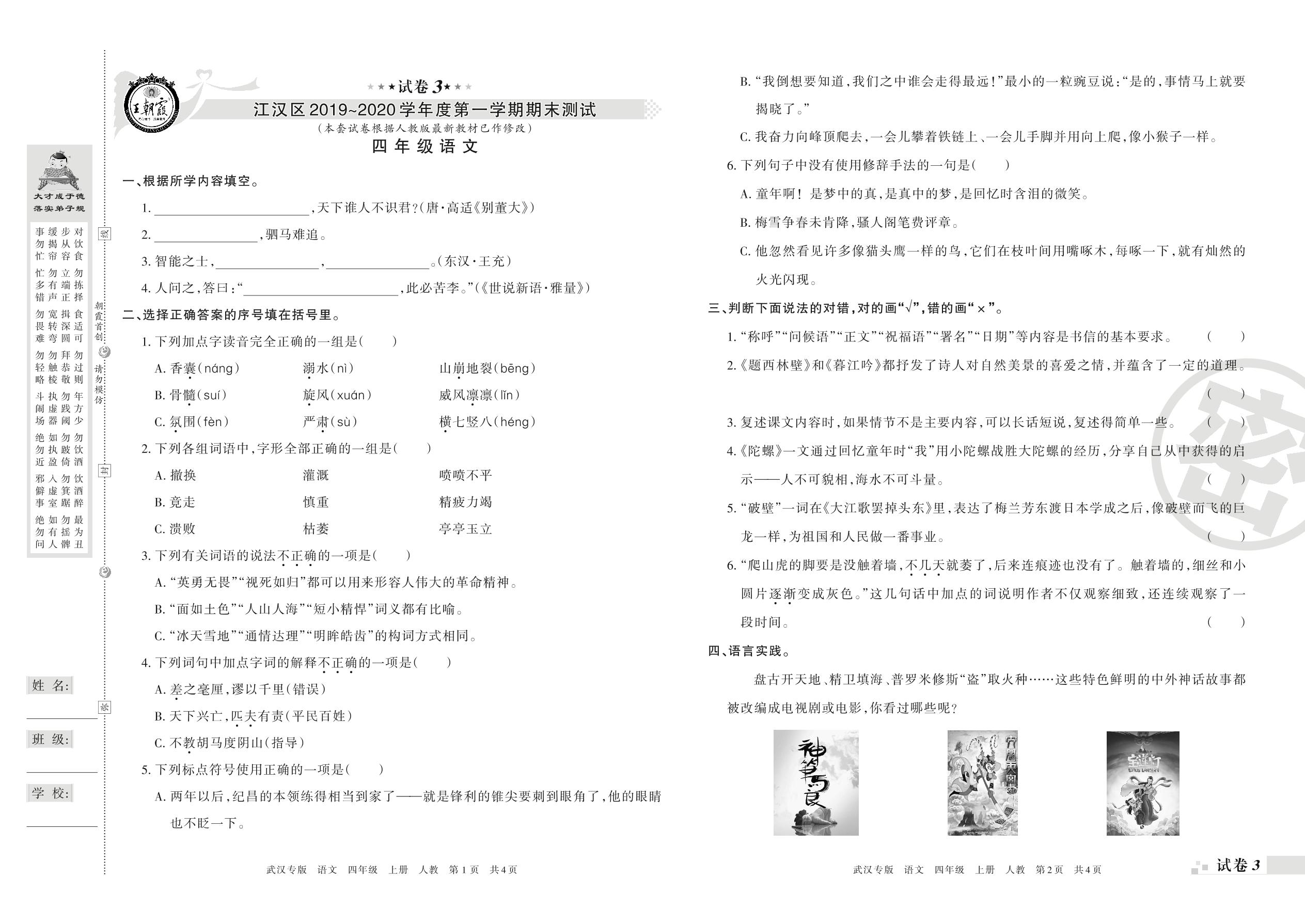 2019-2020学年第一学期武汉市江汉区四年级语文试卷(人教版)【3】