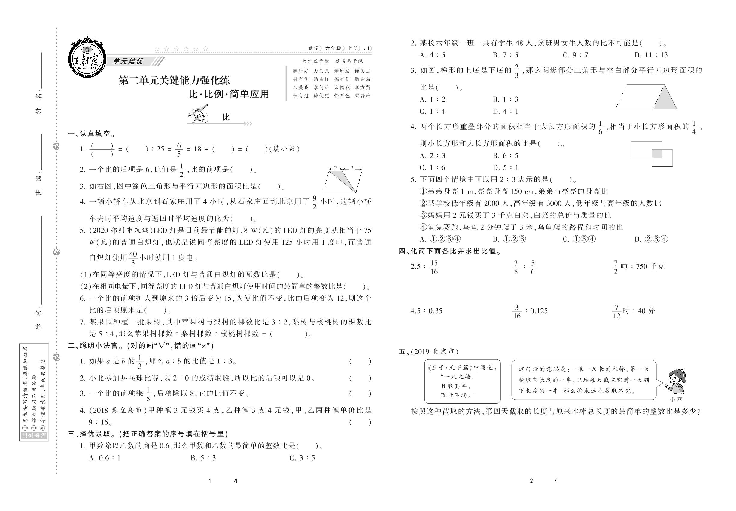 2020上册六年级数学冀教版 第二单元 关键能力强化练