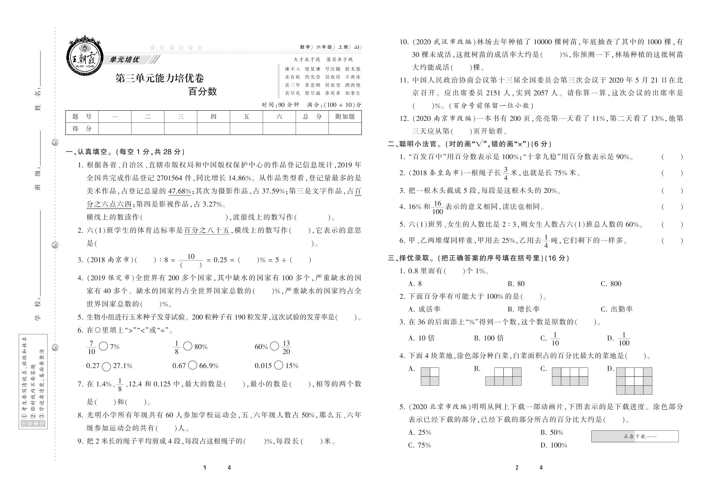 2020上册六年级数学冀教版 第三单元 能力培优卷