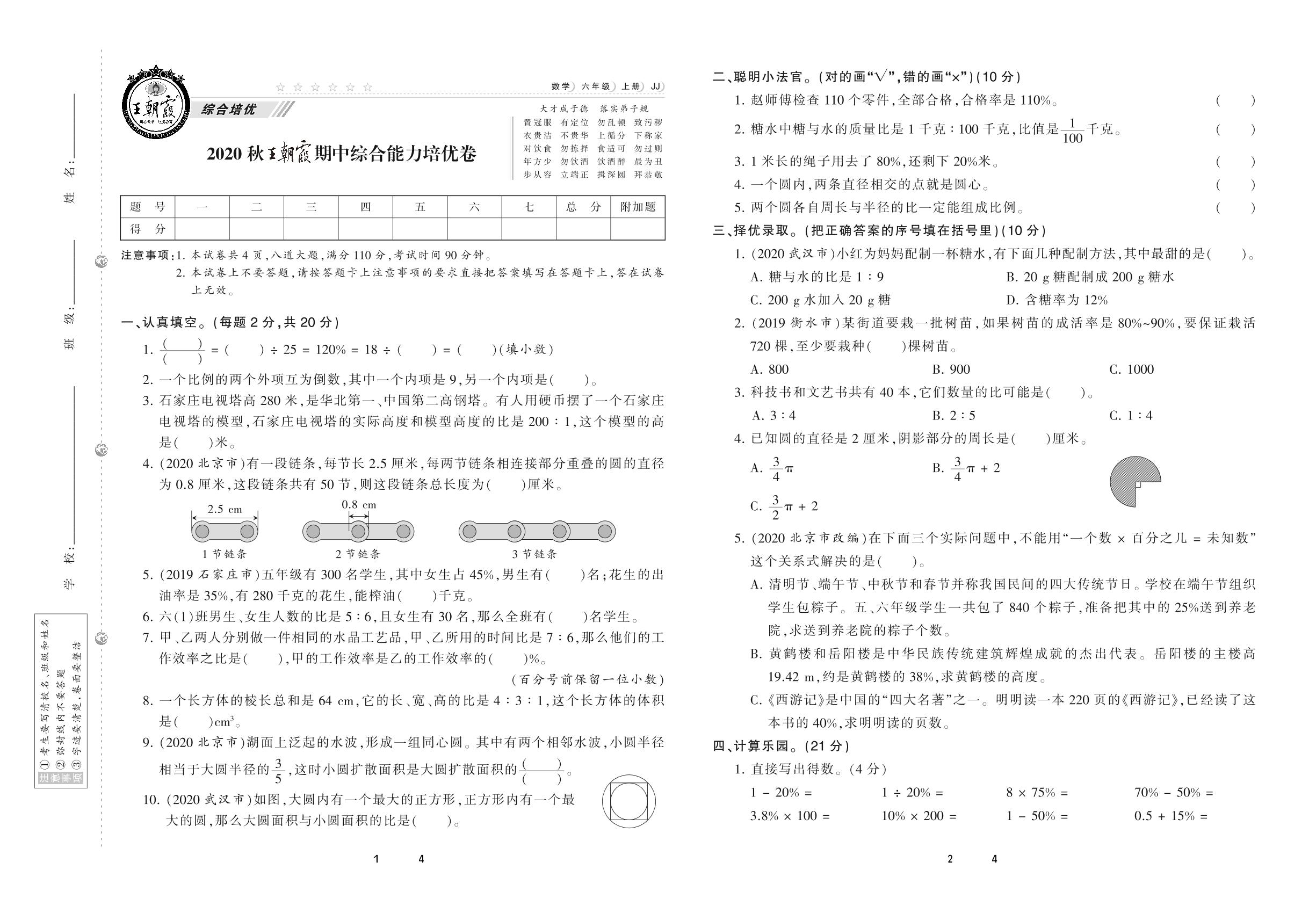 2020上册六年级数学冀教版 王朝霞期中综合能力培优卷