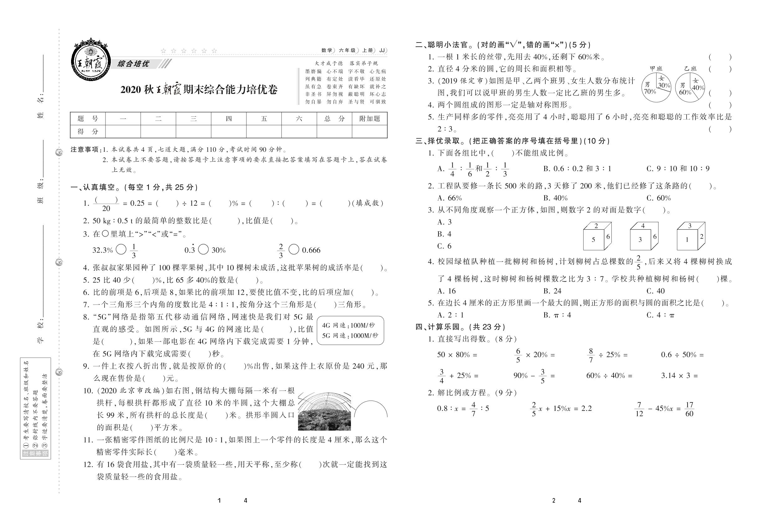 2020上册六年级数学冀教版 王朝霞期末综合能力培优卷