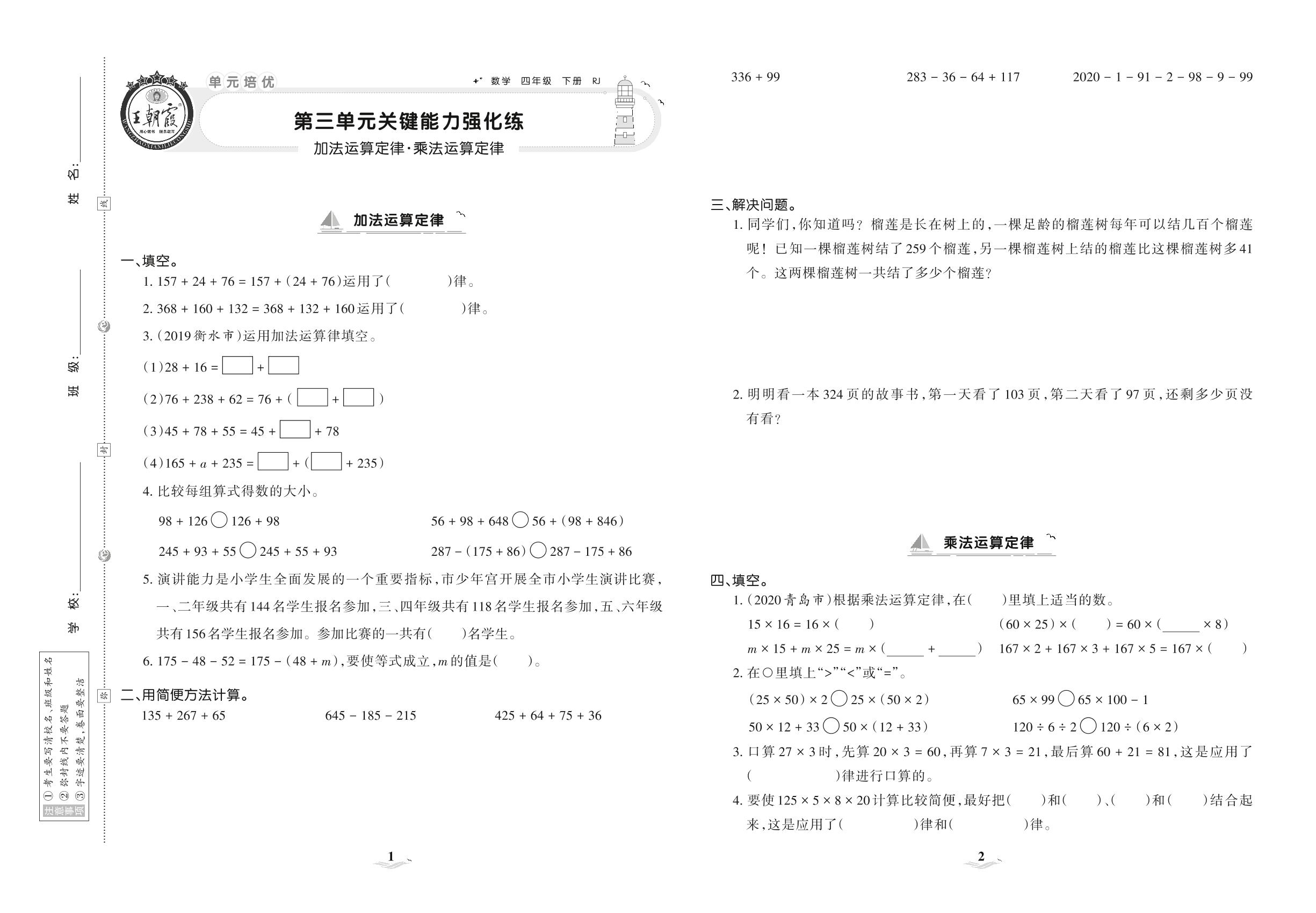 2021下册四年级数学人教版 第三单元 关键能力强化练