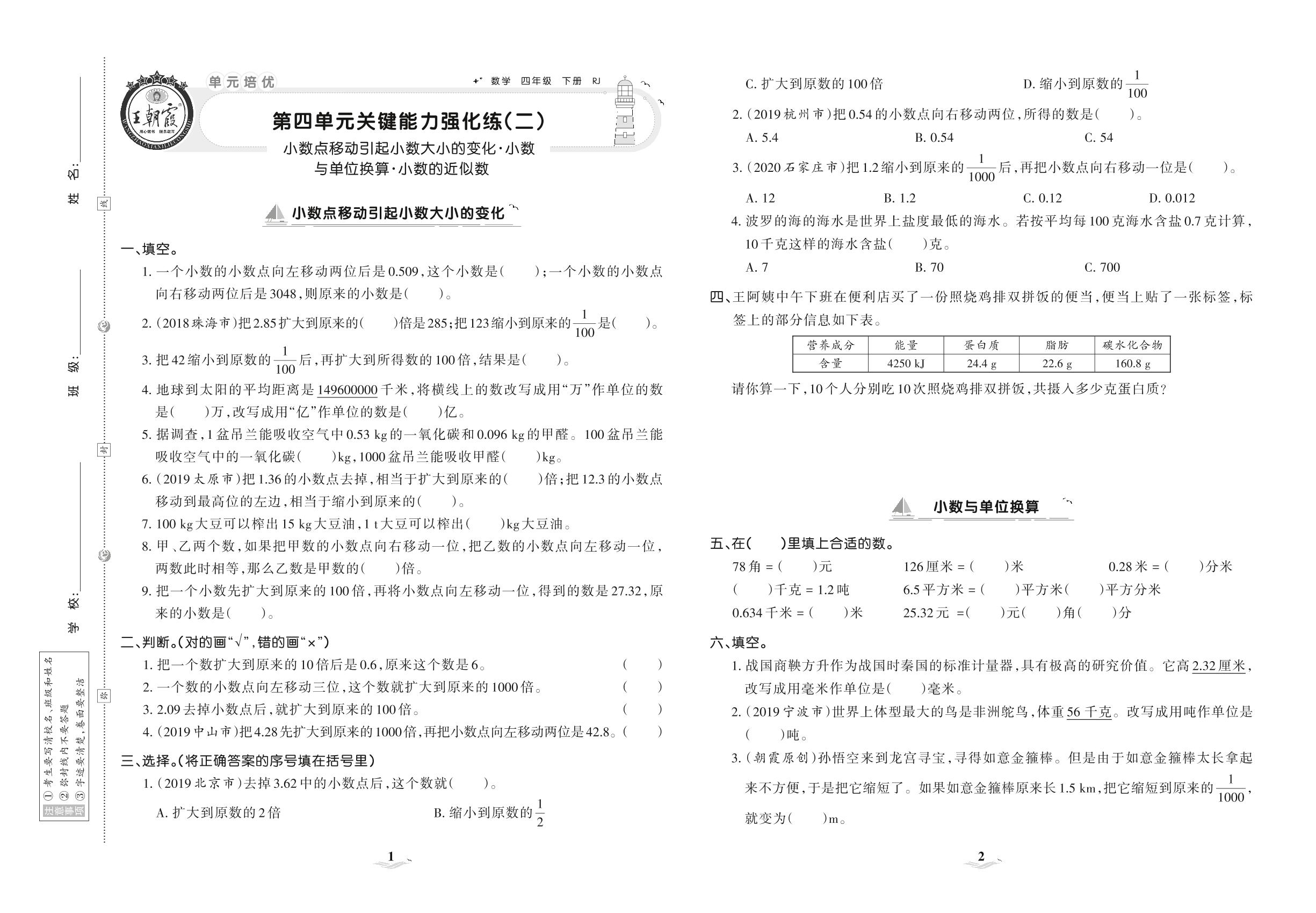 2021下册四年级数学人教版 第四单元 关键能力强化练(二)