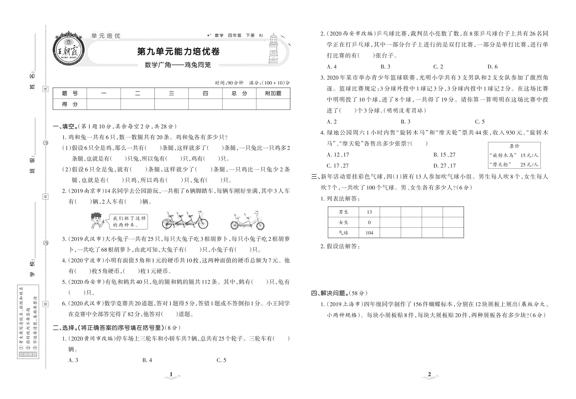 2021下册四年级数学人教版 第九单元 能力培优卷