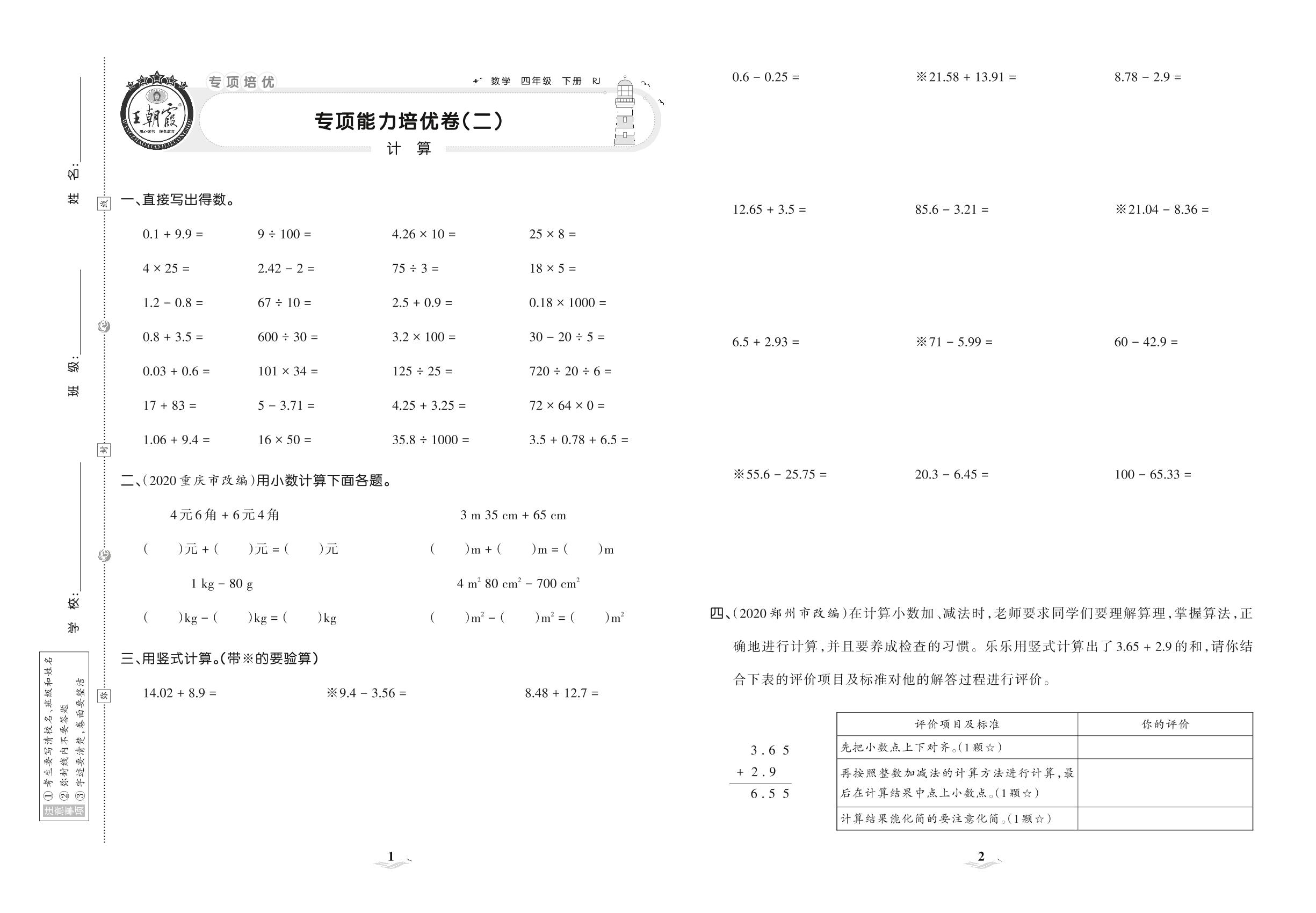2021下册四年级数学人教版 专项能力培优卷(二) 计算