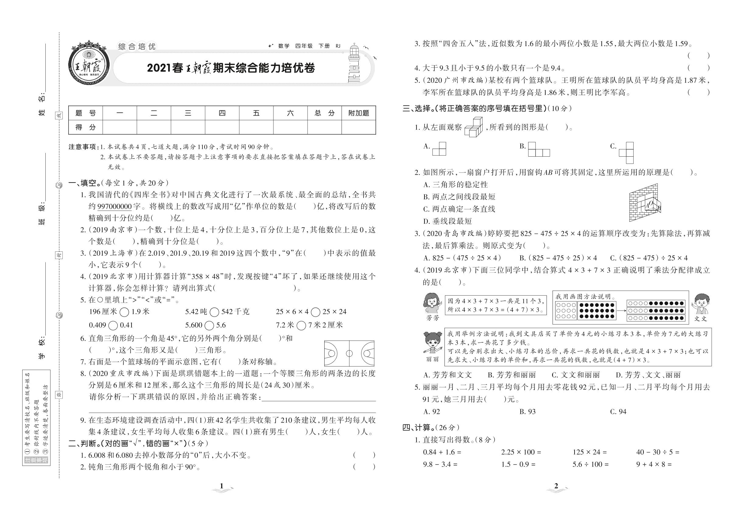 2021下册四年级数学人教版 王朝霞期末综合能力培优卷