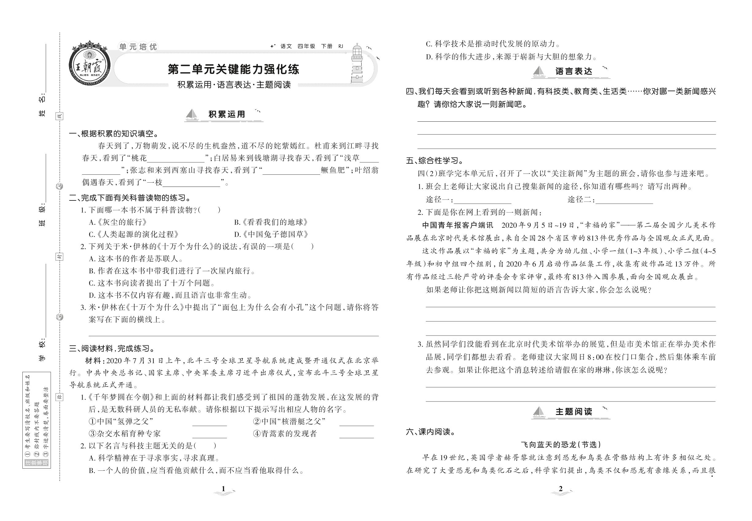 2021下册四年级语文人教版 第二单元 关键能力强化练