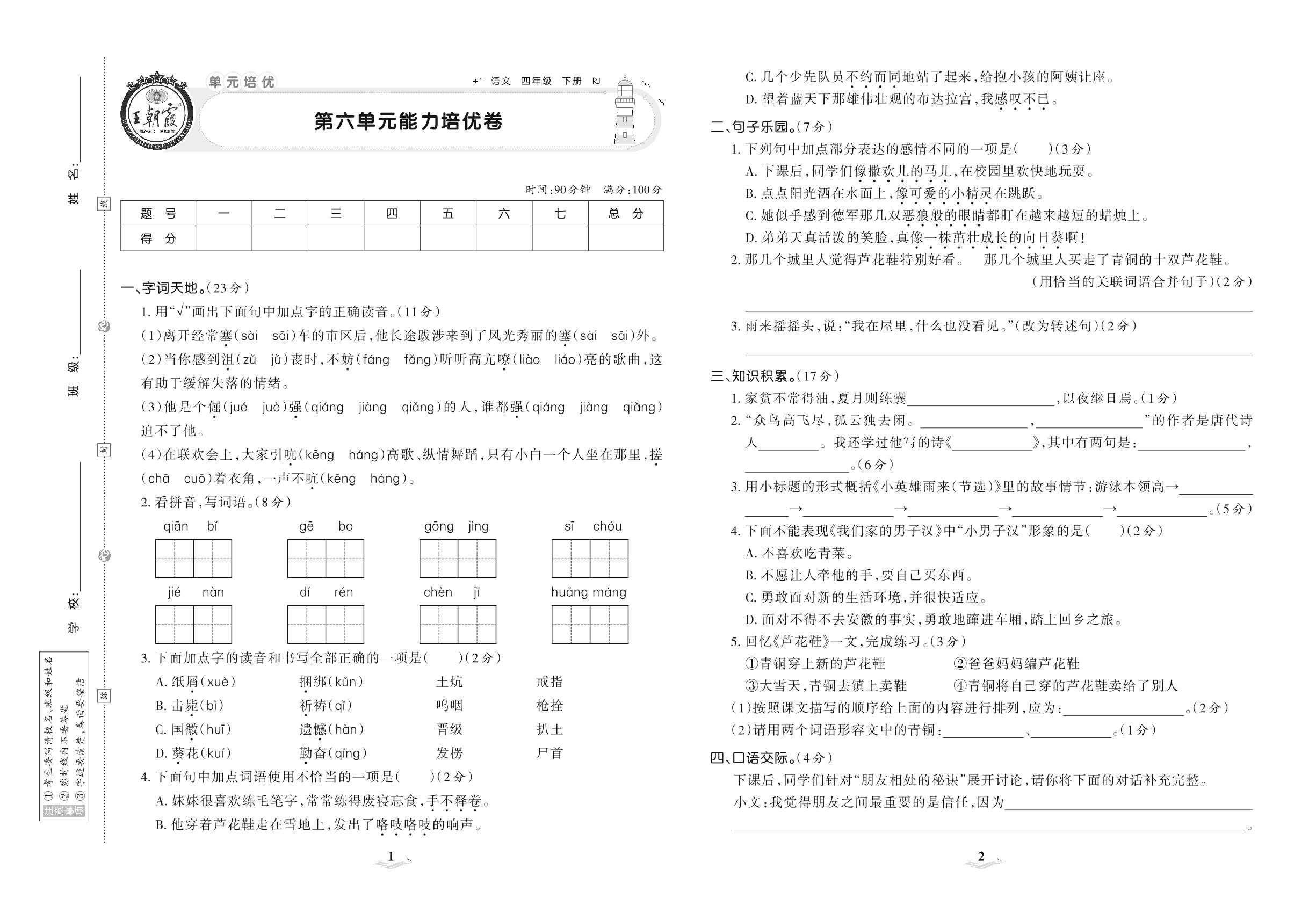 四年级语文人教版下册单元卷