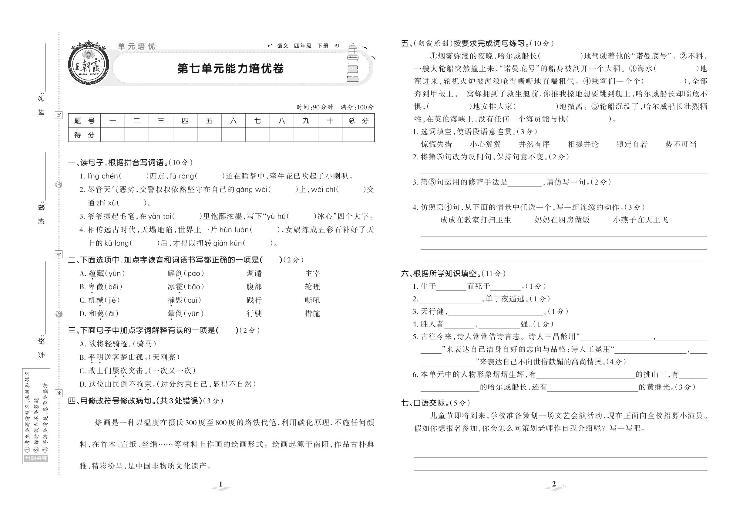 2021下册四年级语文人教版 第七单元 能力培优卷