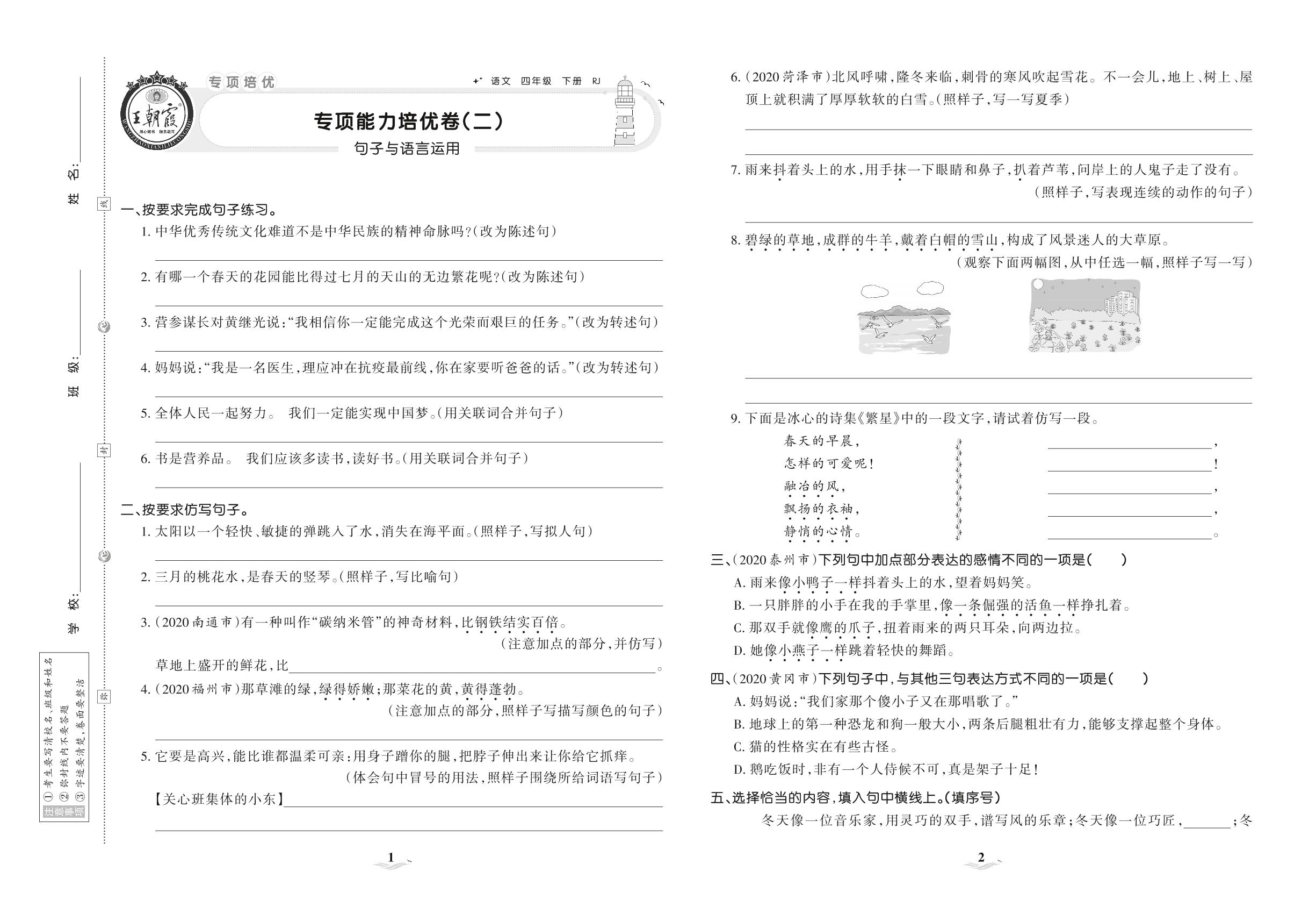 2021下册四年级语文人教版 专项能力培优卷(二) 句子与语言运用