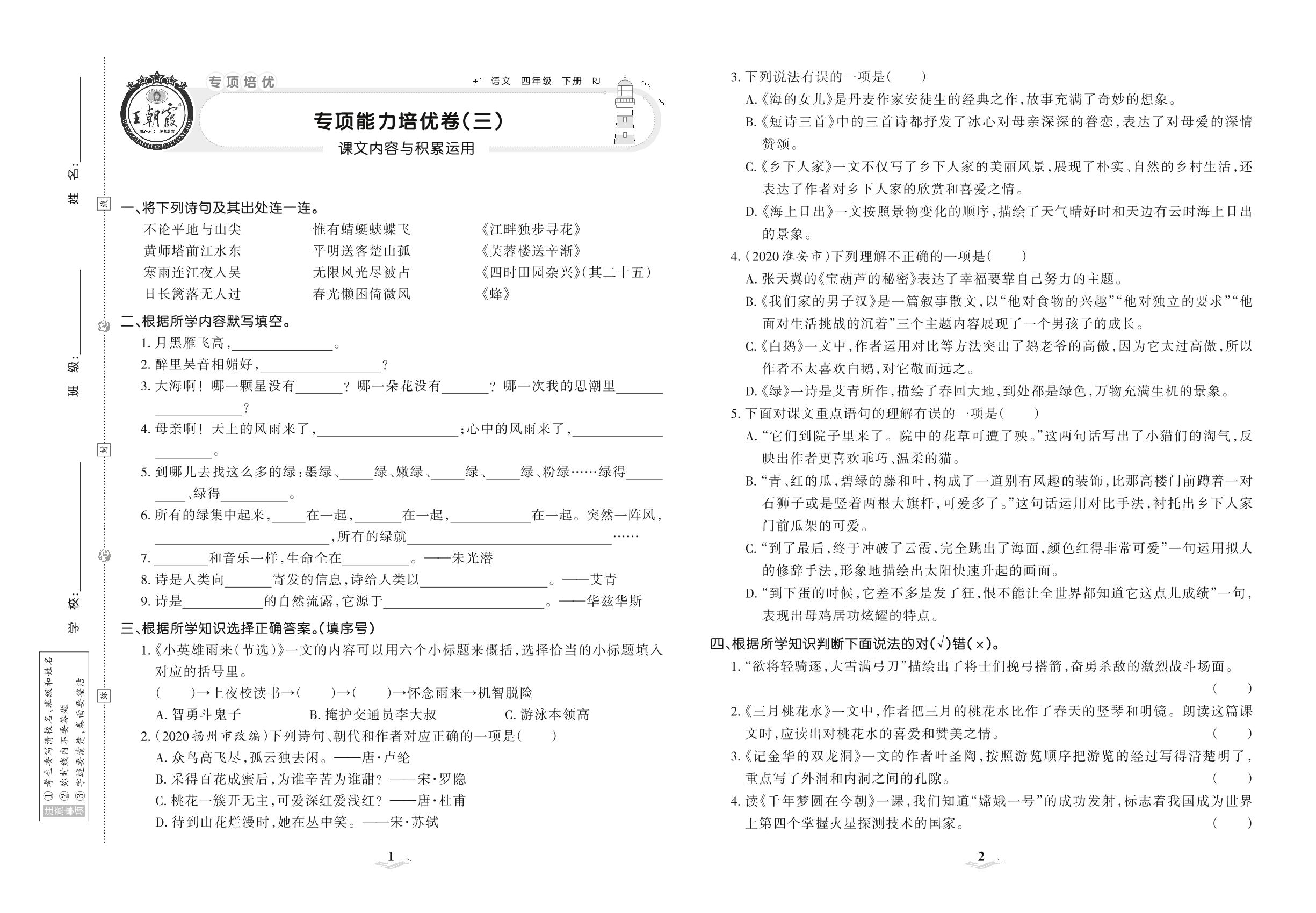 2021下册四年级语文人教版 专项能力培优卷(三) 课文内容与积累运用