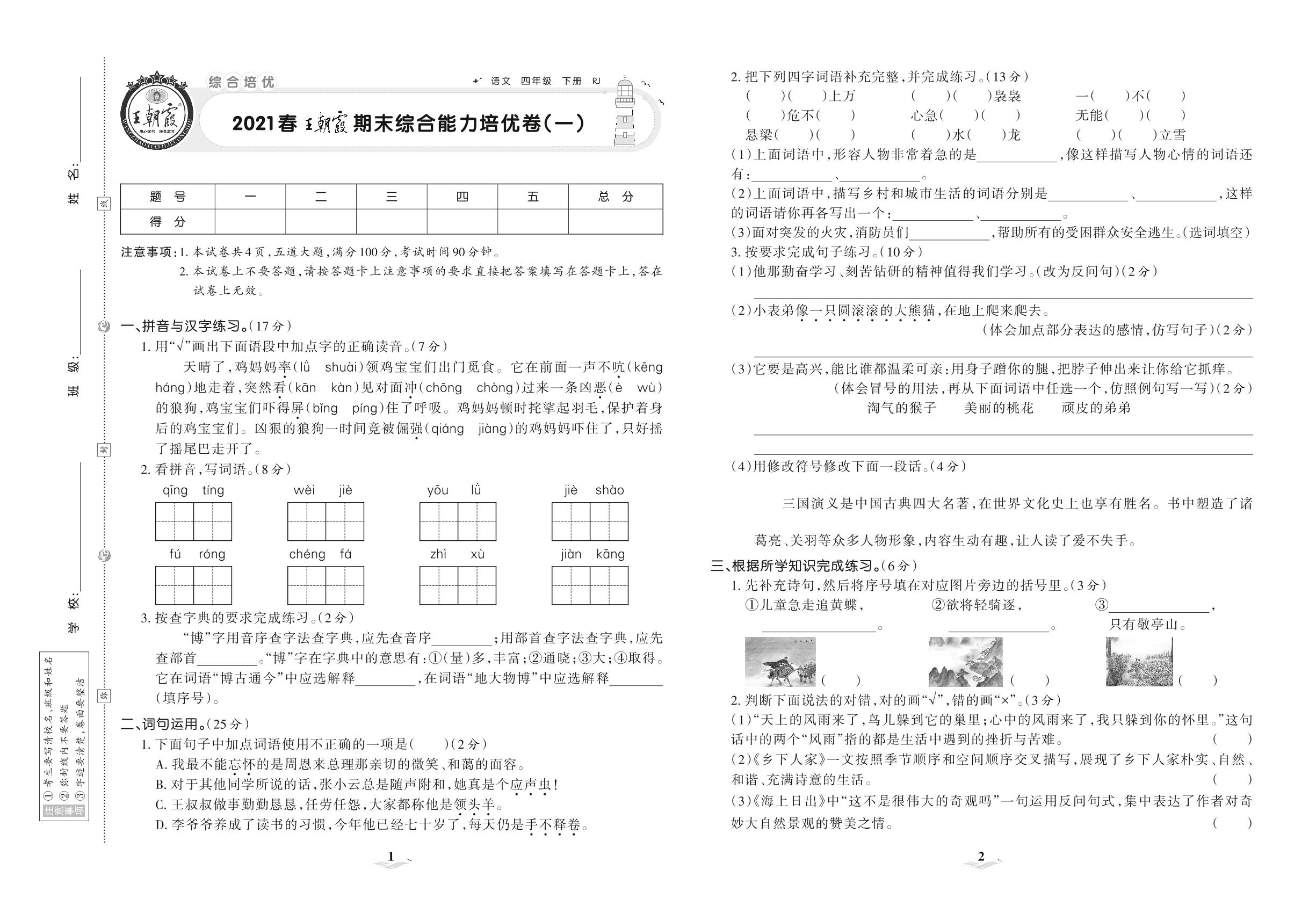 2021下册四年级语文人教版 王朝霞期末综合能力培优卷(一)