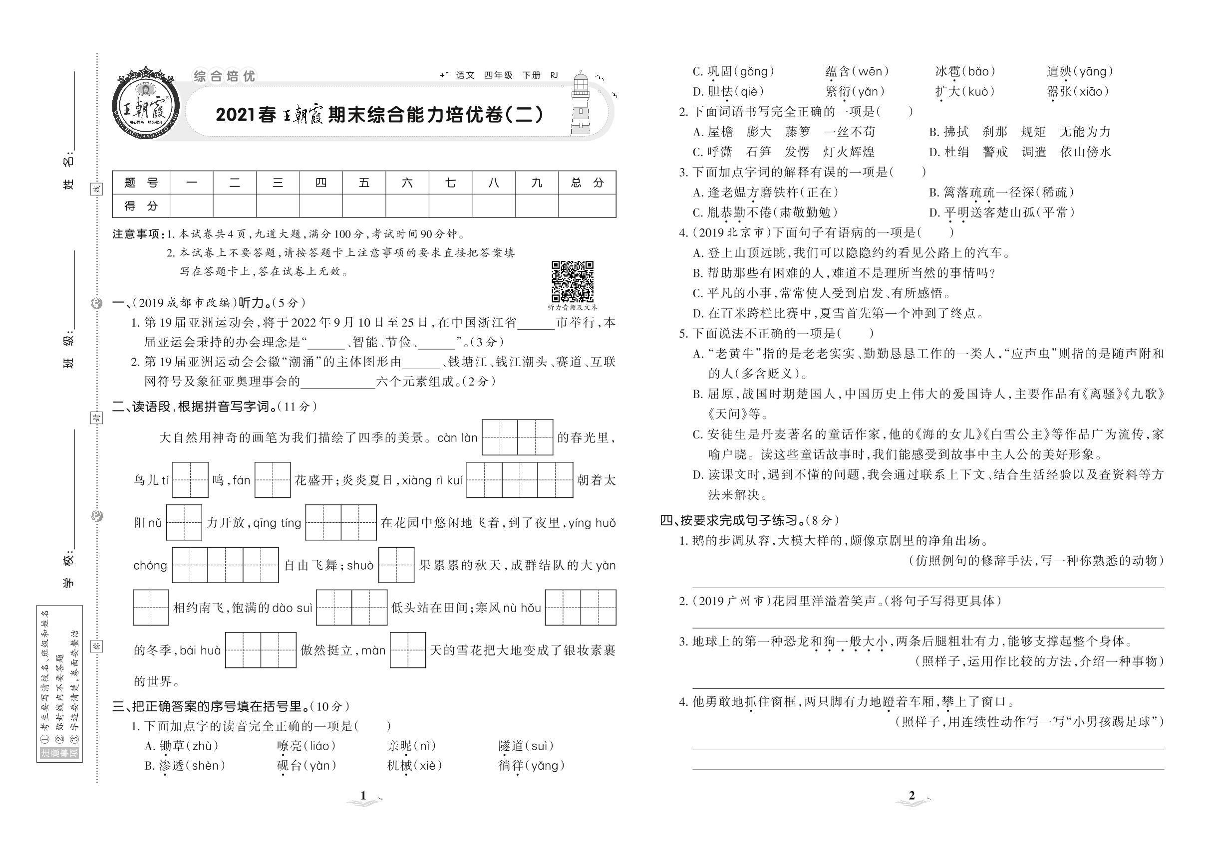 2021下册四年级语文人教版 王朝霞期末综合能力培优卷(二)