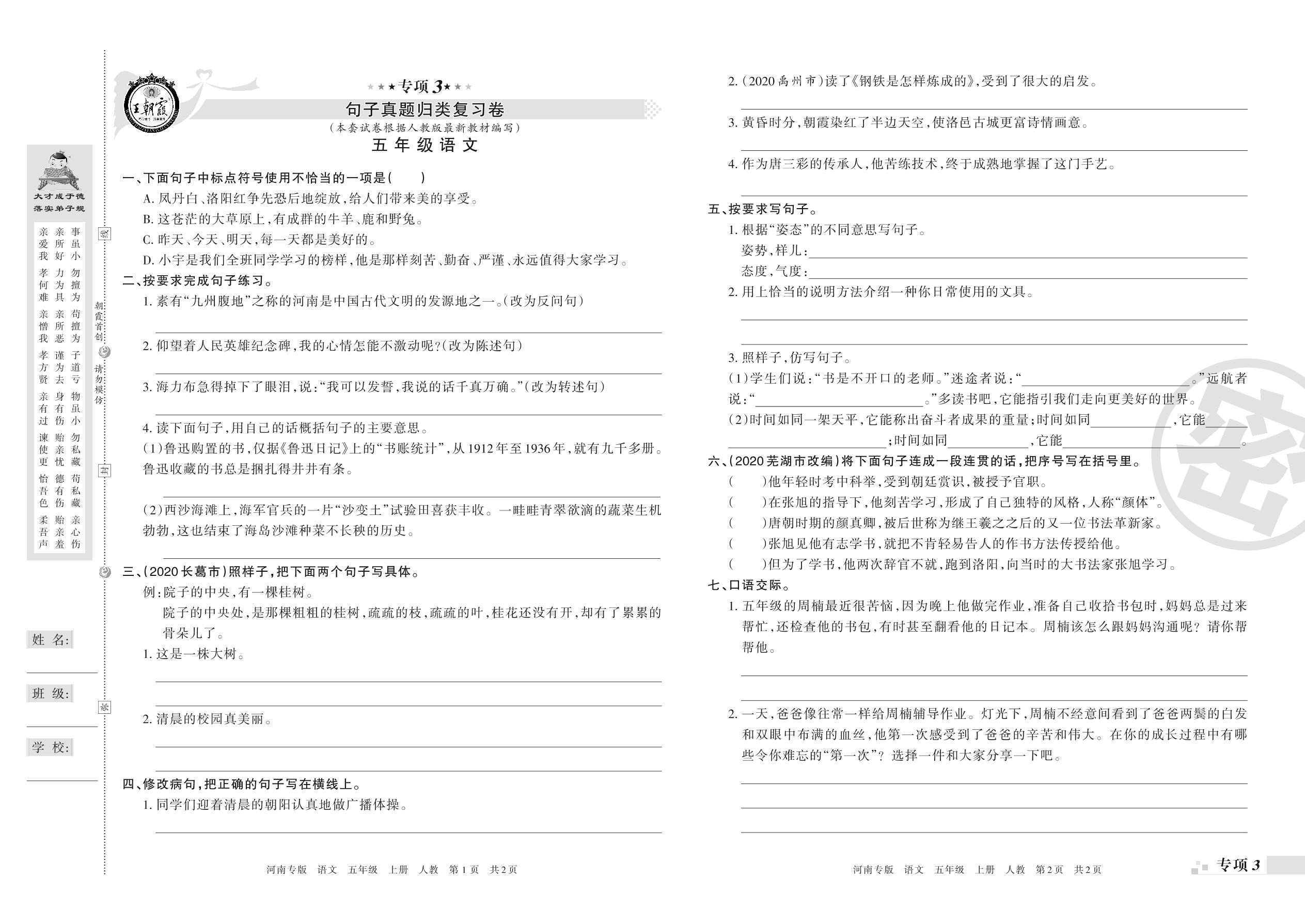 王朝霞期末专项卷——句子、课文内容与积累运用真题归类复习五年级上册语文(人教版)【0】