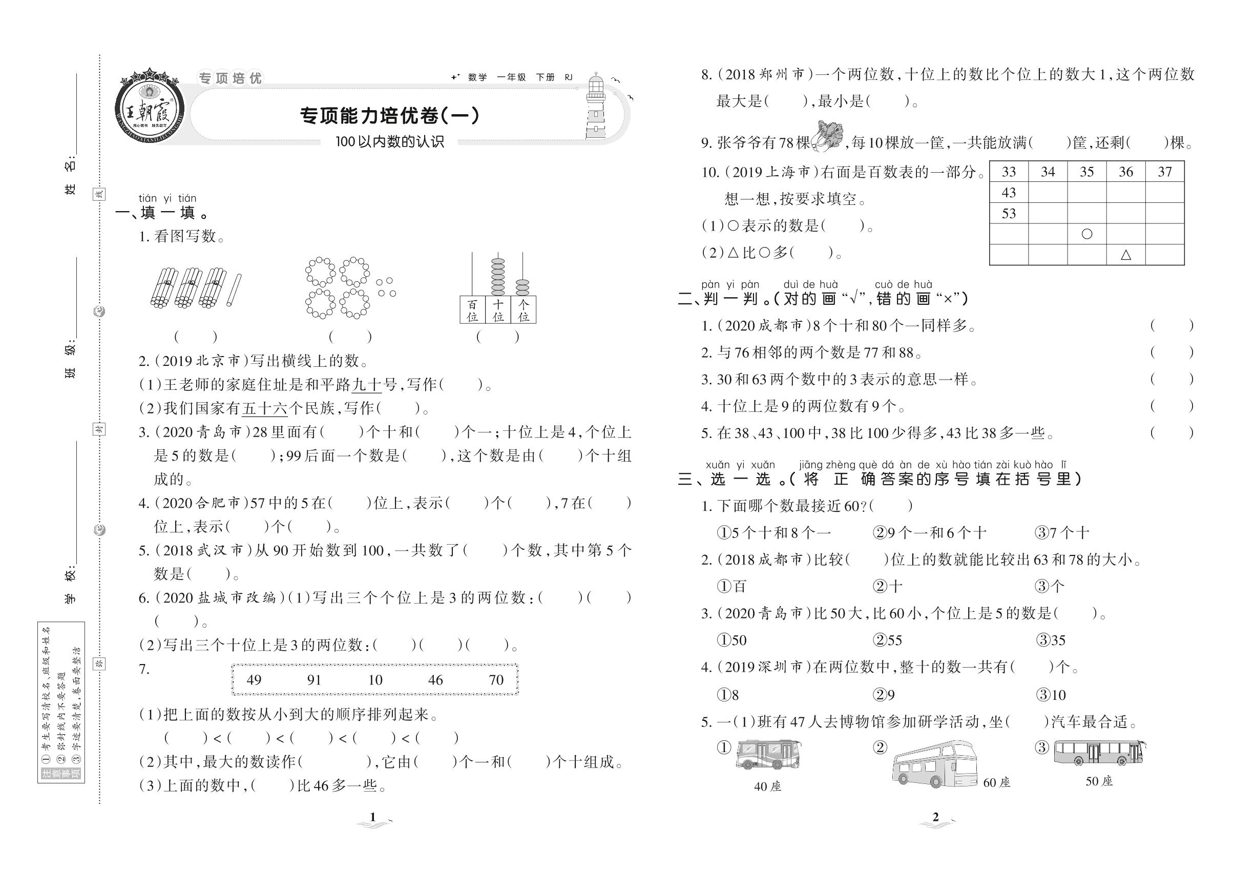 2021下册一年级数学人教版 专项能力培优卷(一) 100以内数的认识
