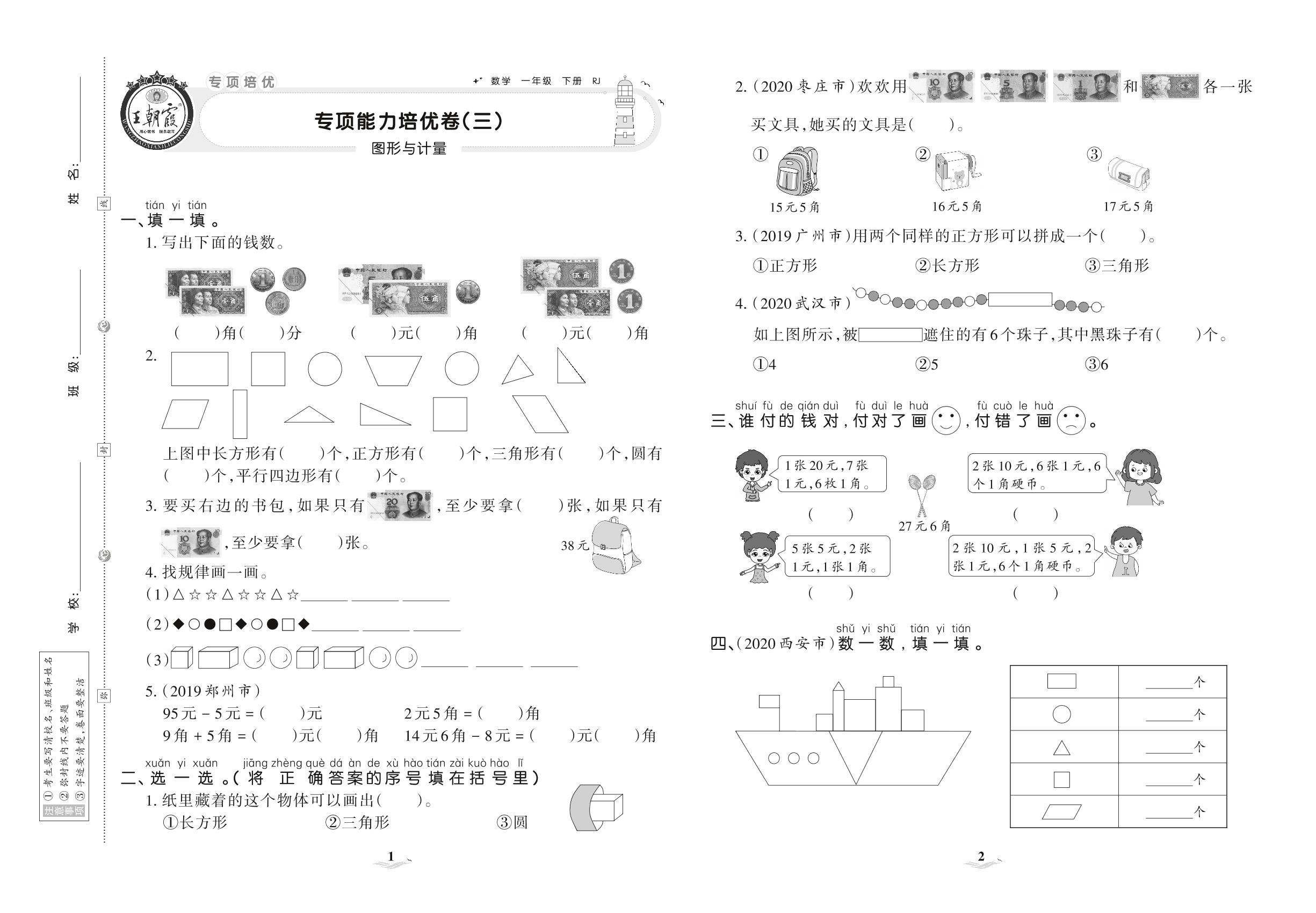 2021下册一年级数学人教版 专项能力培优卷(三) 图形与计量