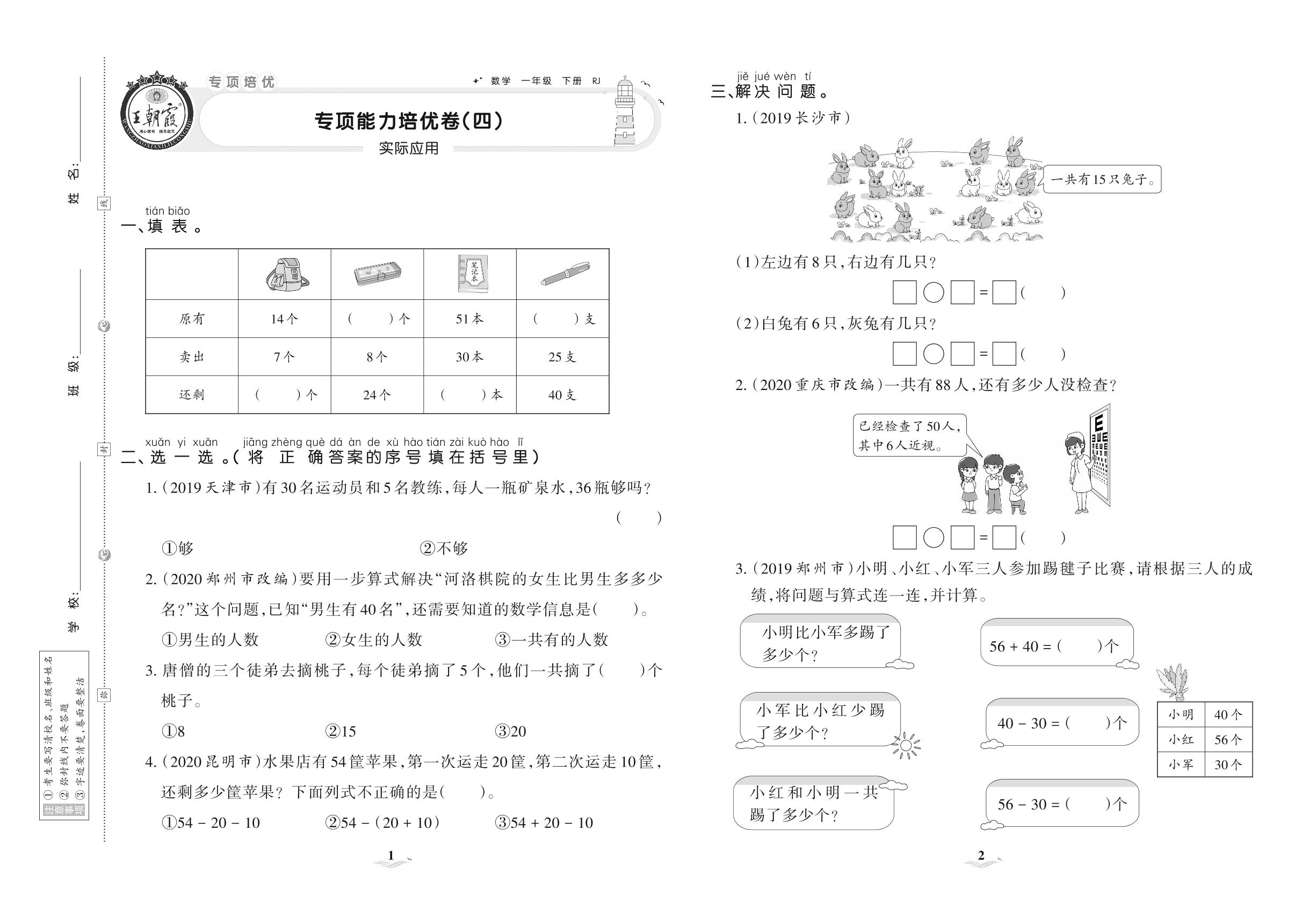 2021下册一年级数学人教版 专项能力培优卷(四) 实际应用