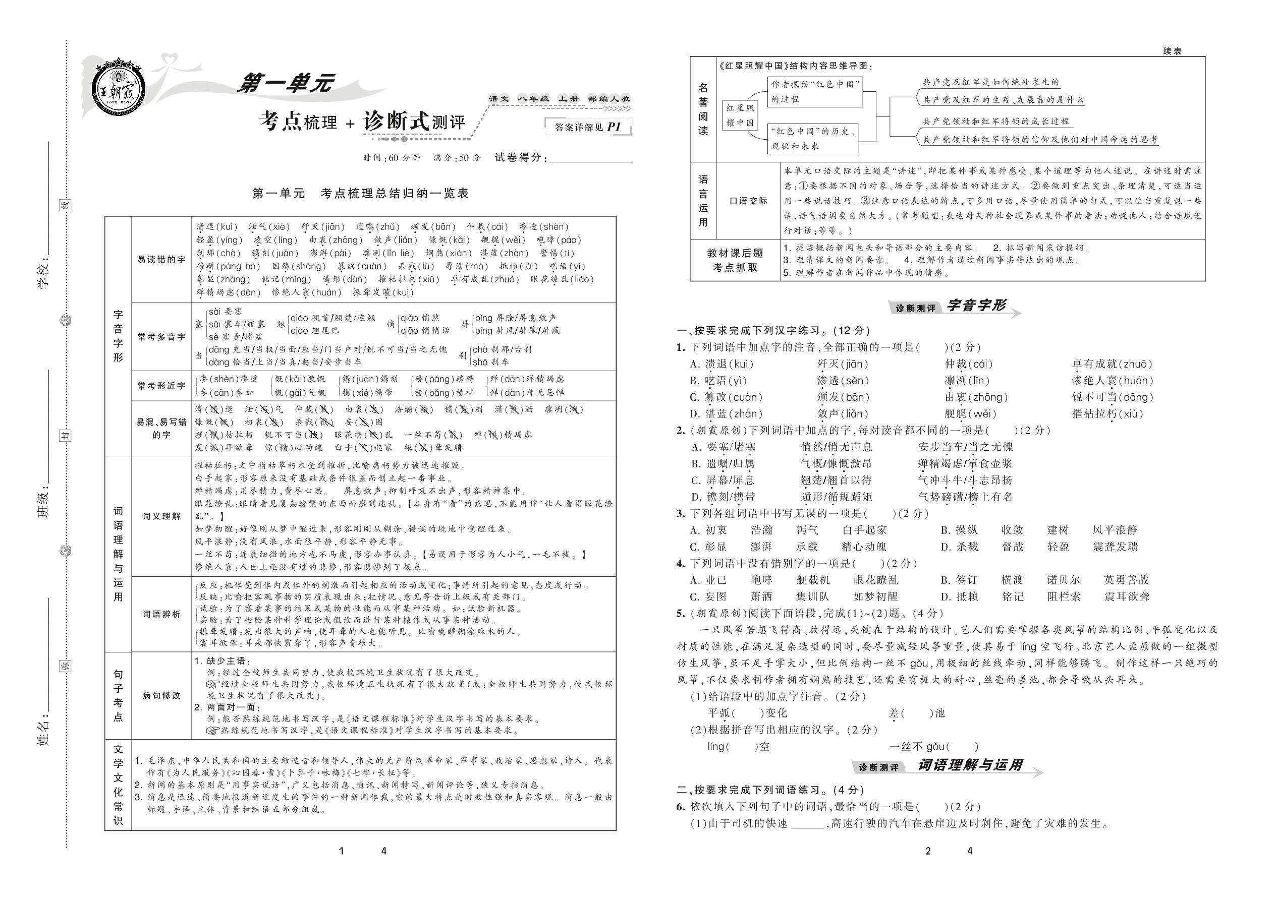 2020上册八年级语文人教版 第一单元 考点梳理+诊断式测评
