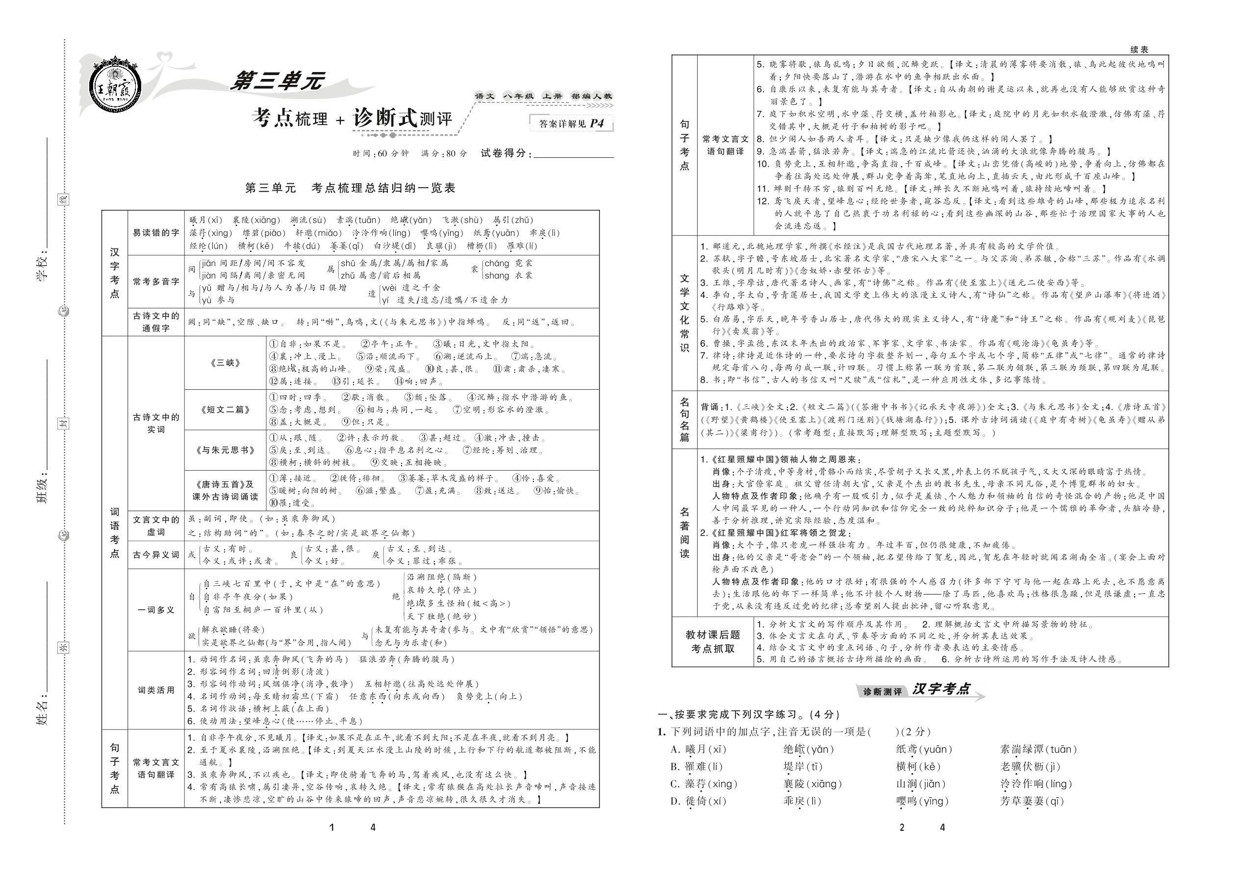 2020上册八年级语文人教版 第三单元 考点梳理+诊断式测评