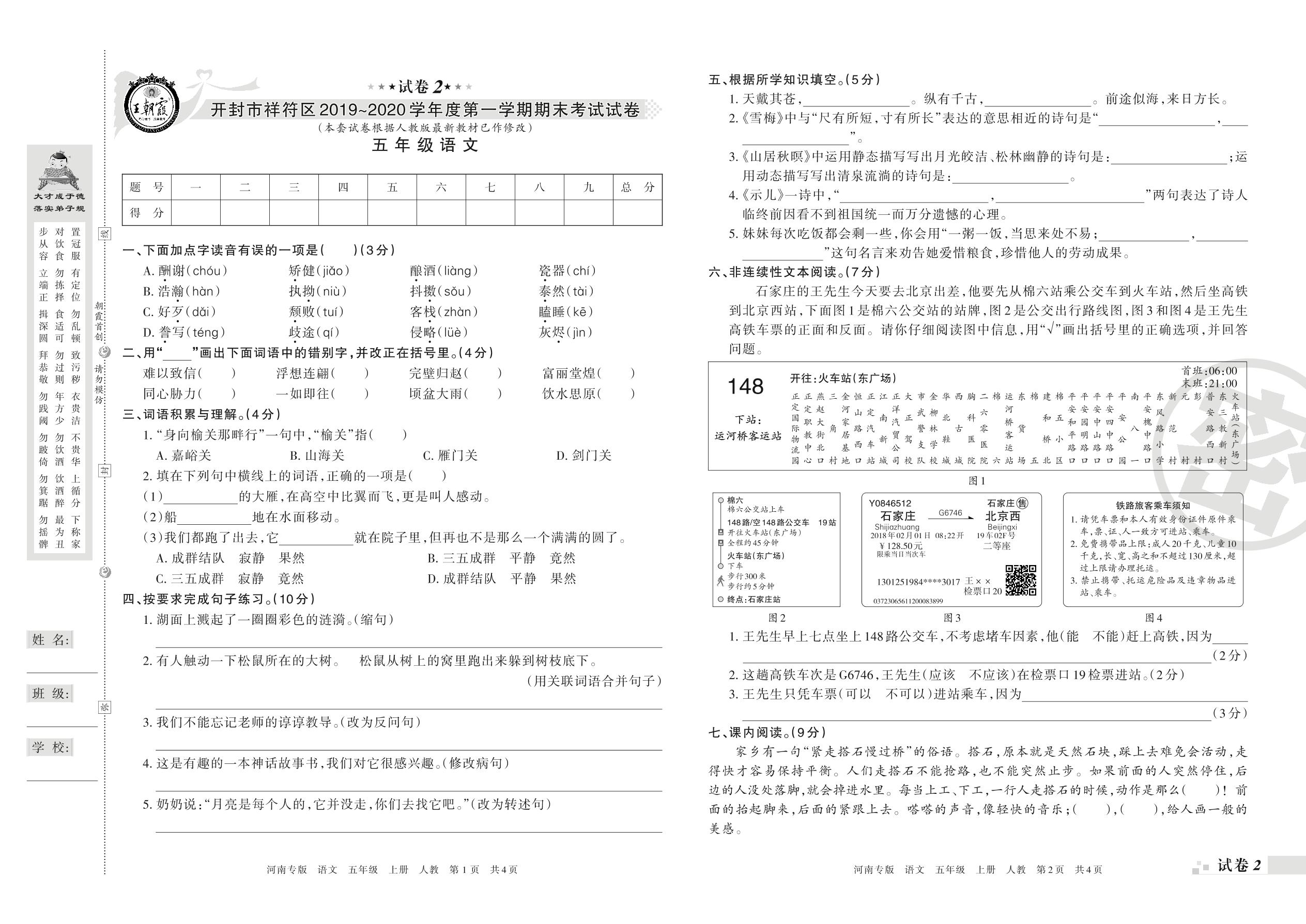 2019-2020学年第一学期开封市祥符区五年级语文试卷(人教版)【2】