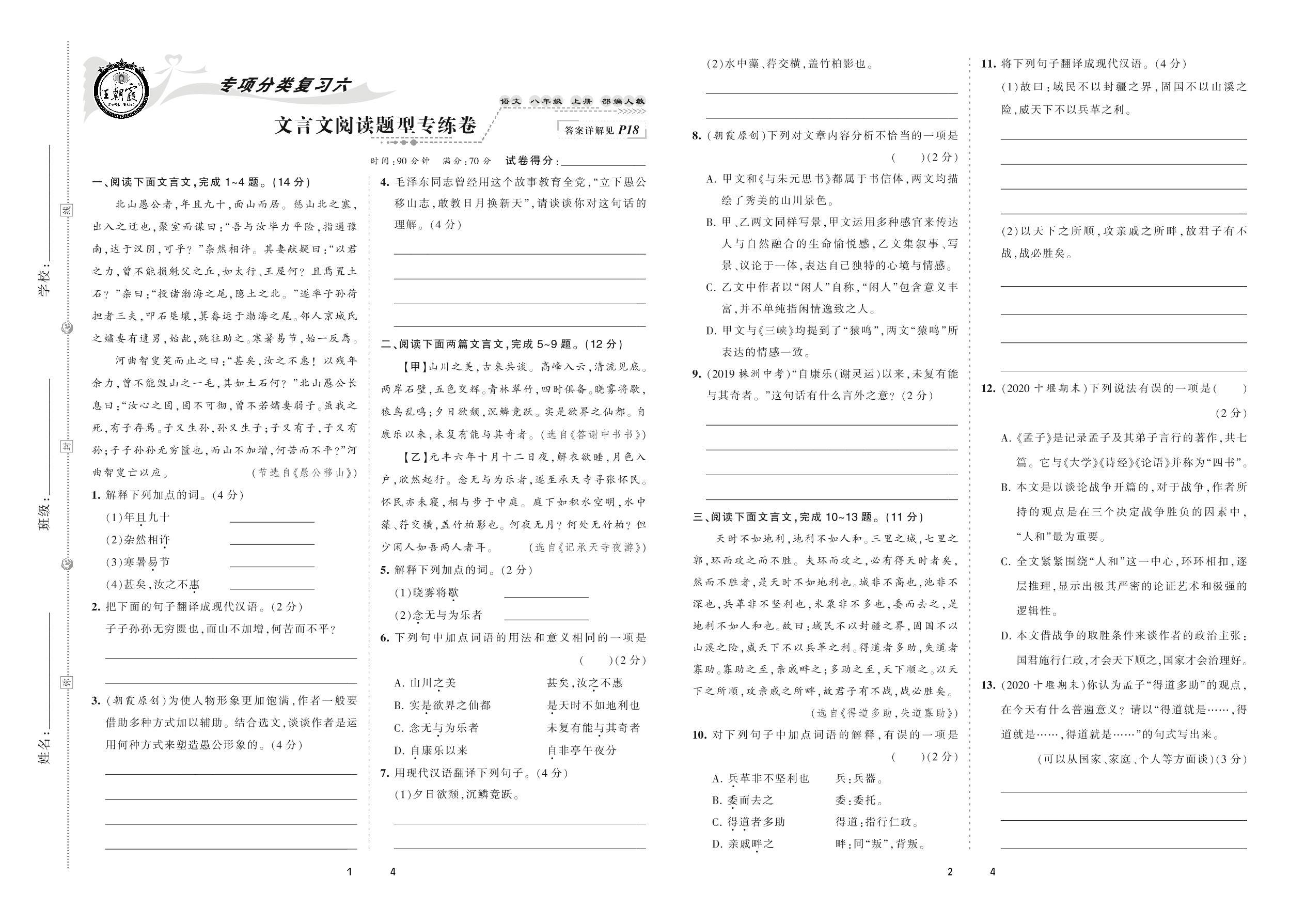 2020上册八年级语文人教版 文言文阅读题型专练卷