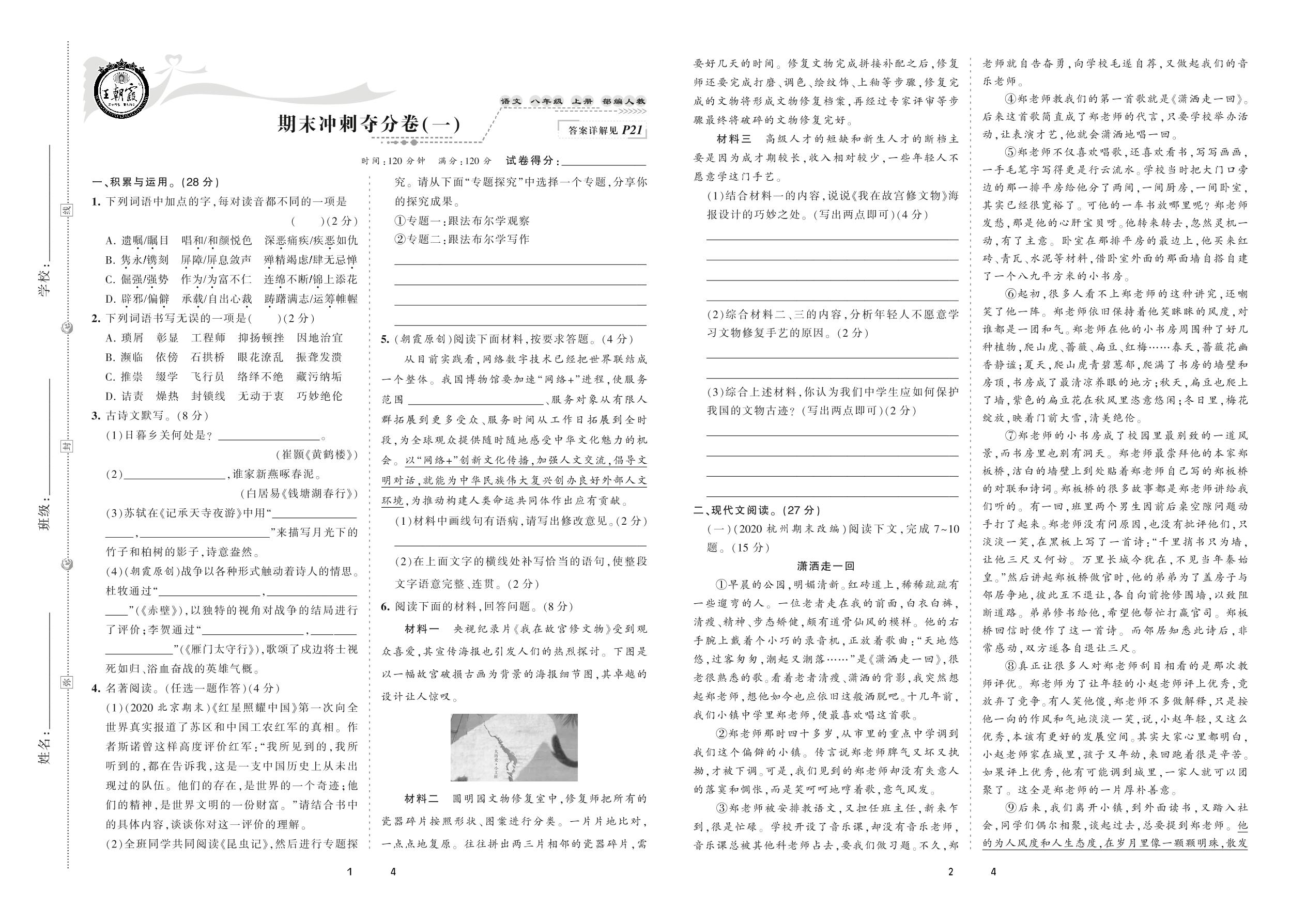2020上册八年级语文人教版 期末冲刺夺分卷(一)