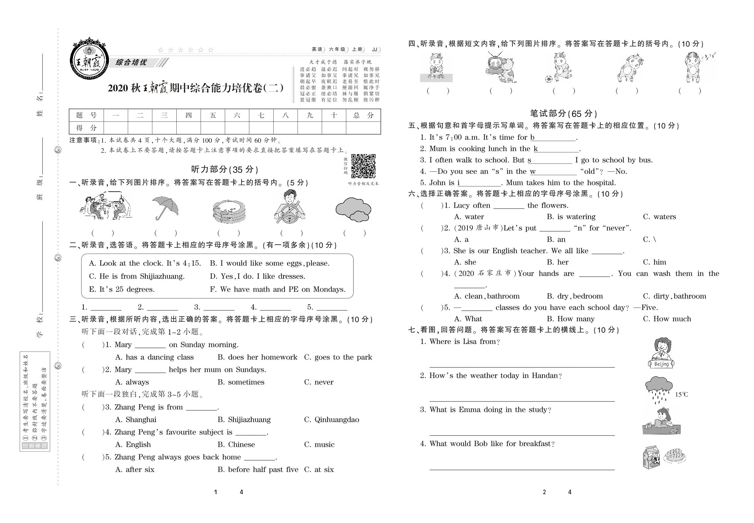2020上册六年级英语冀教版 王朝霞期中综合能力培优卷(二)