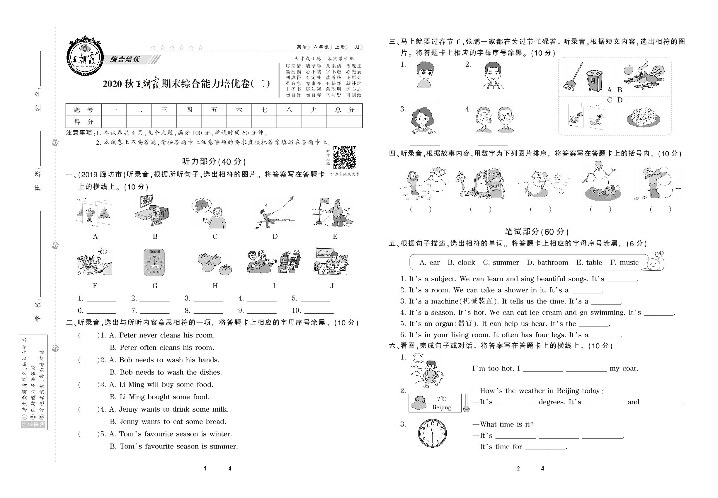 2020上册六年级英语冀教版 王朝霞期末综合能力培优卷(二)