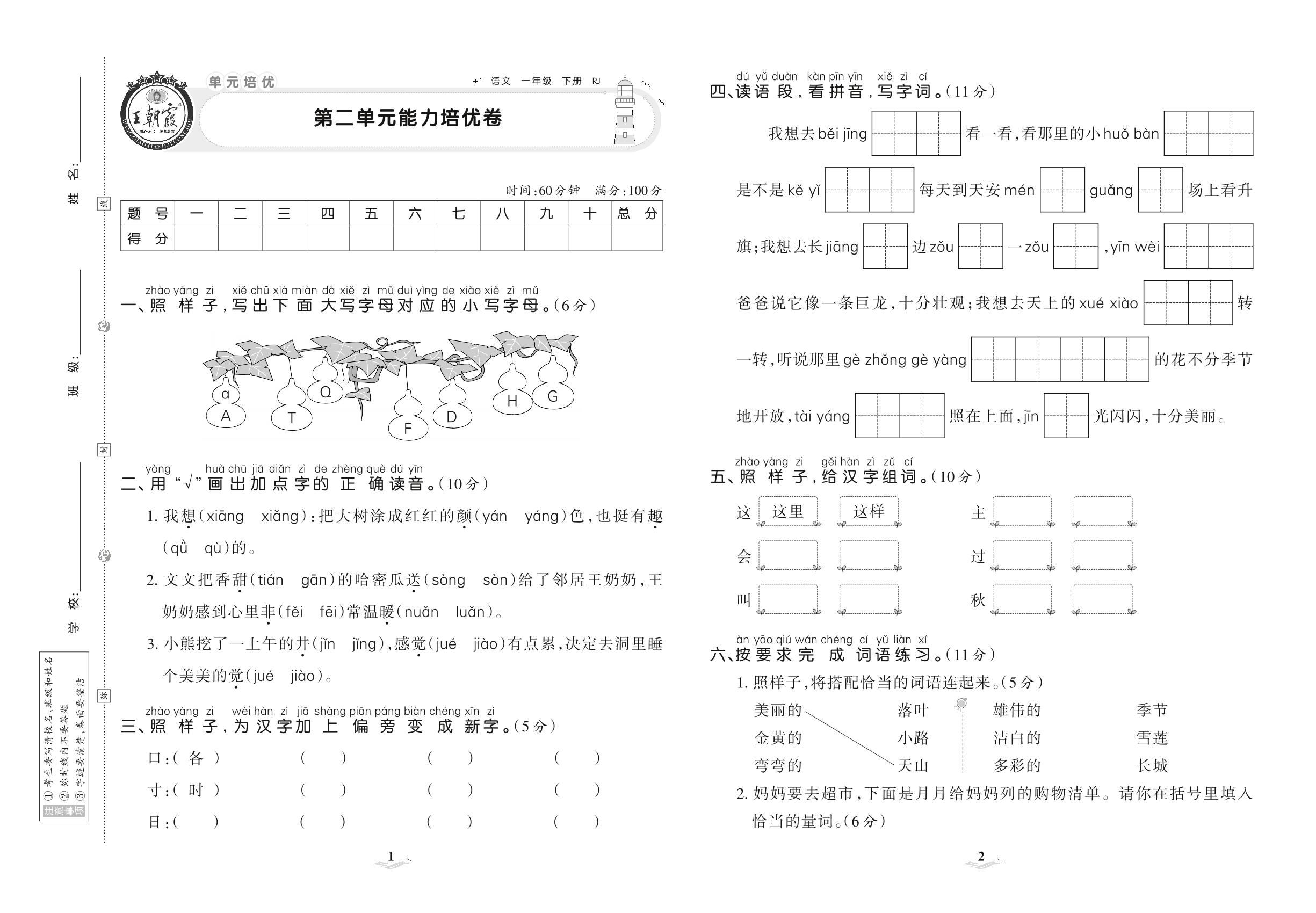 2021下册一年级语文人教版 第二单元 能力培优卷