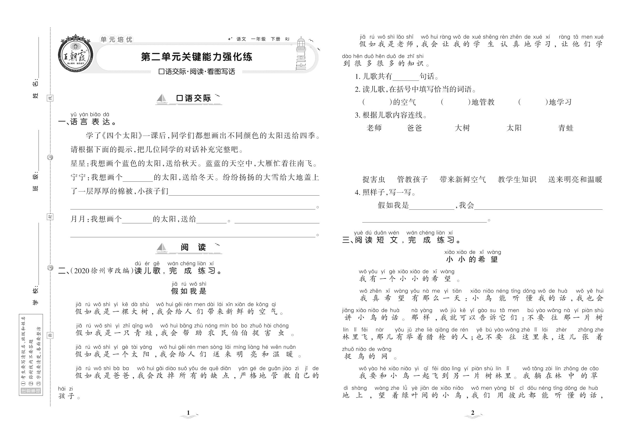 2021下册一年级语文人教版 第二单元 关键能力强化练