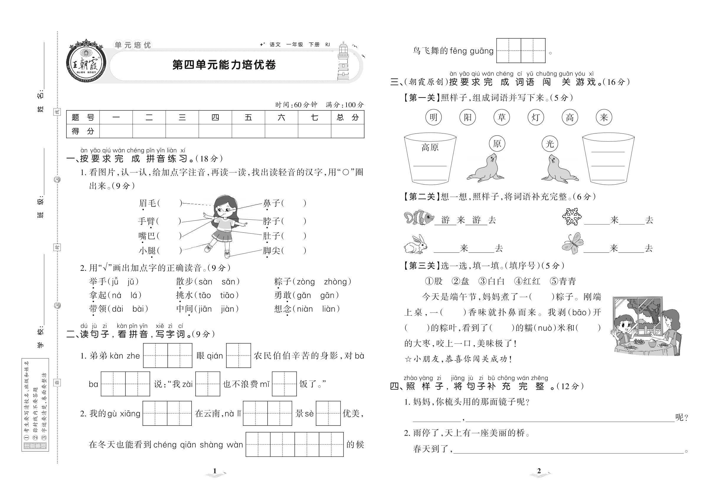 2021下册一年级语文人教版 第四单元 能力培优卷