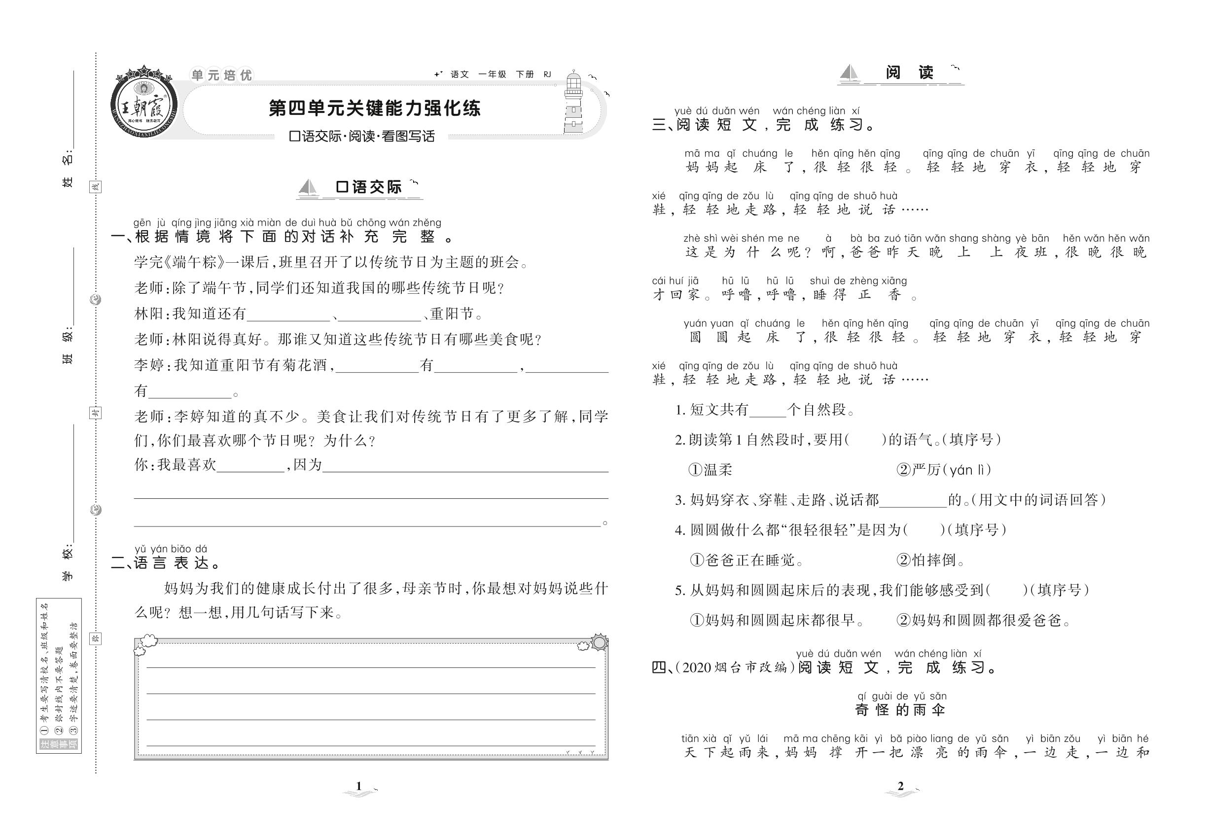 2021下册一年级语文人教版 第四单元 关键能力强化练