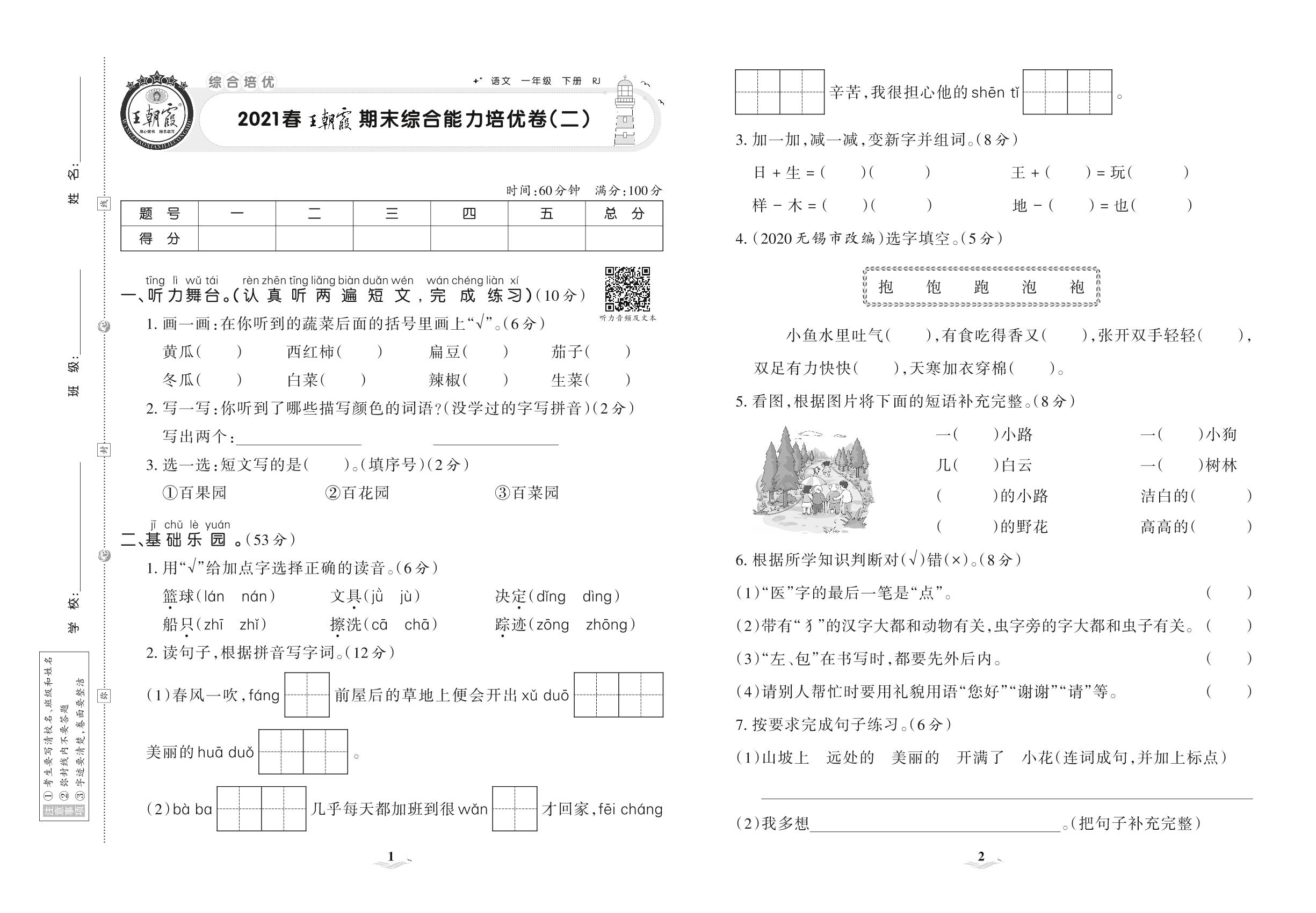 2021下册一年级语文人教版 王朝霞期末综合能力培优卷(二)